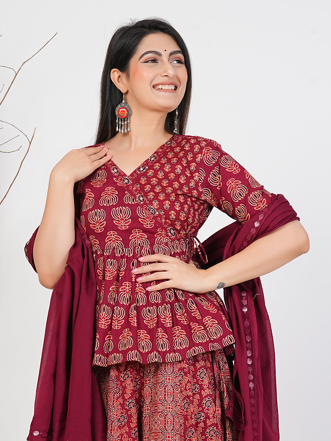 Ruii Fashion Maroon Peony-Print Peplum Kurta with Flared Palazzos