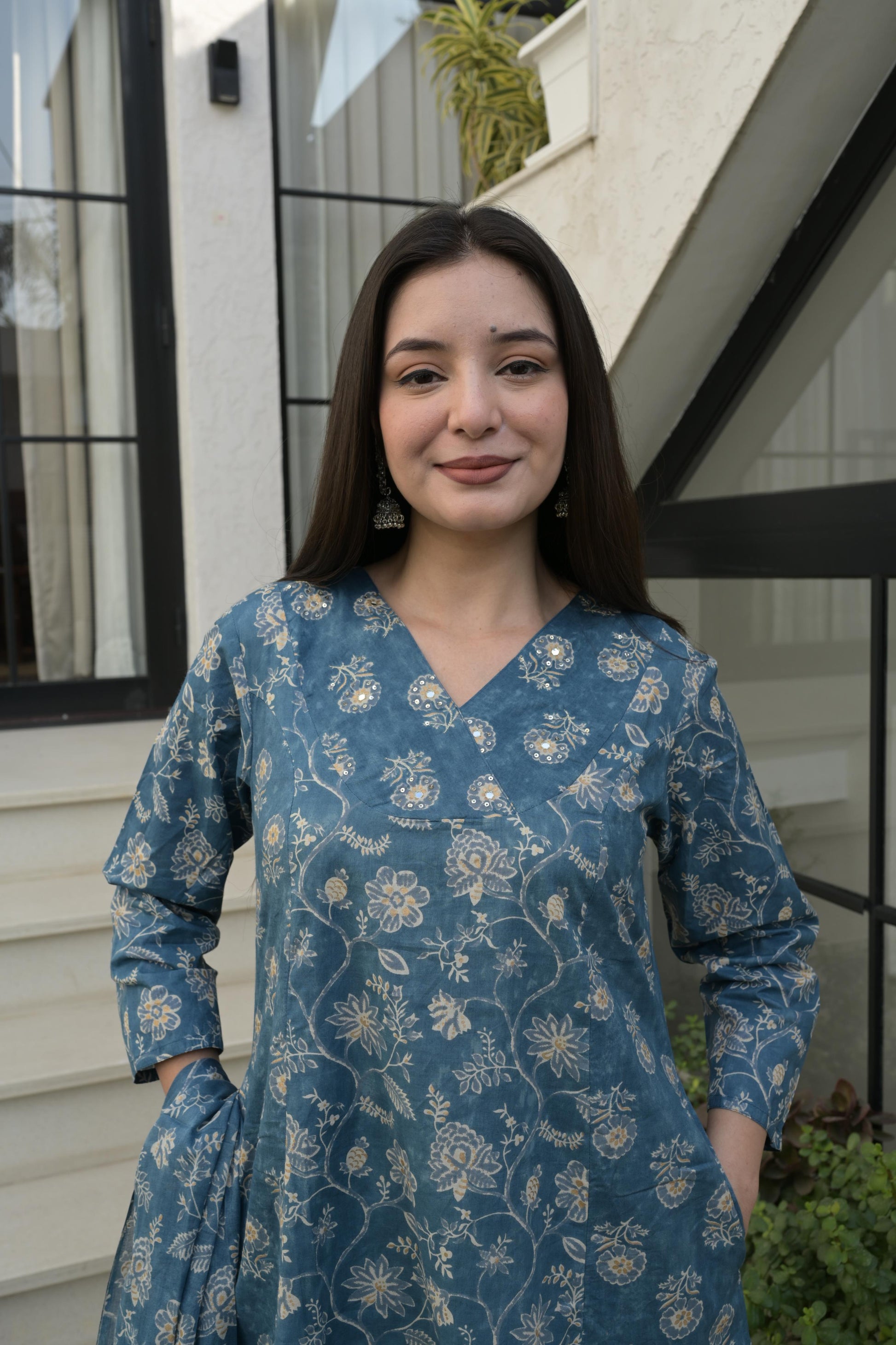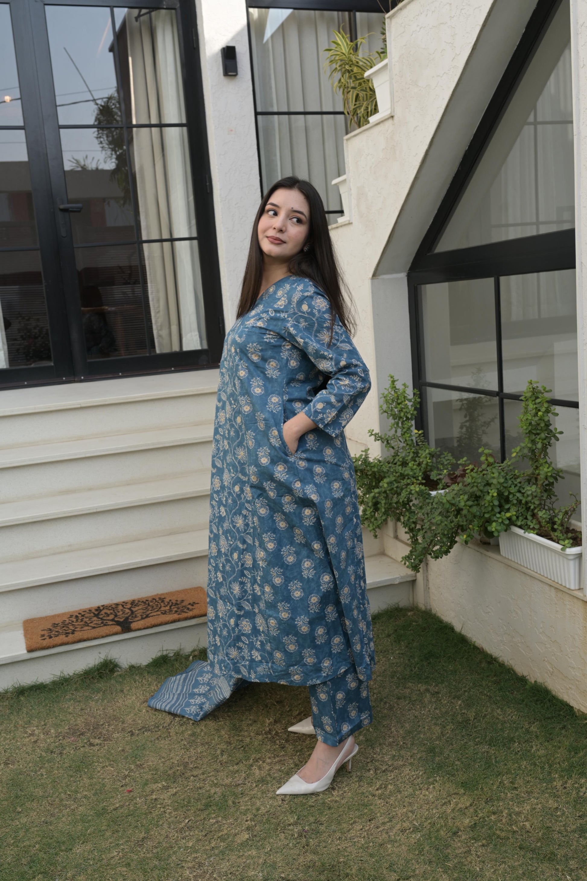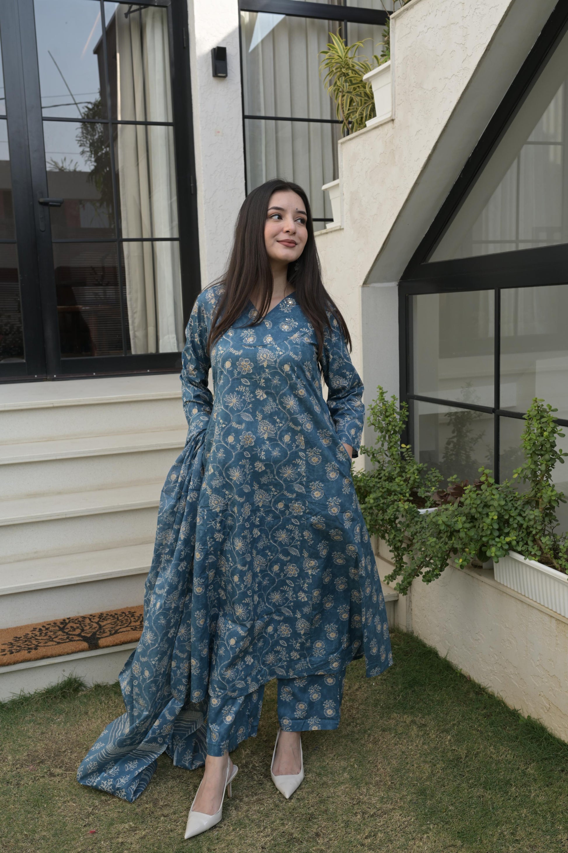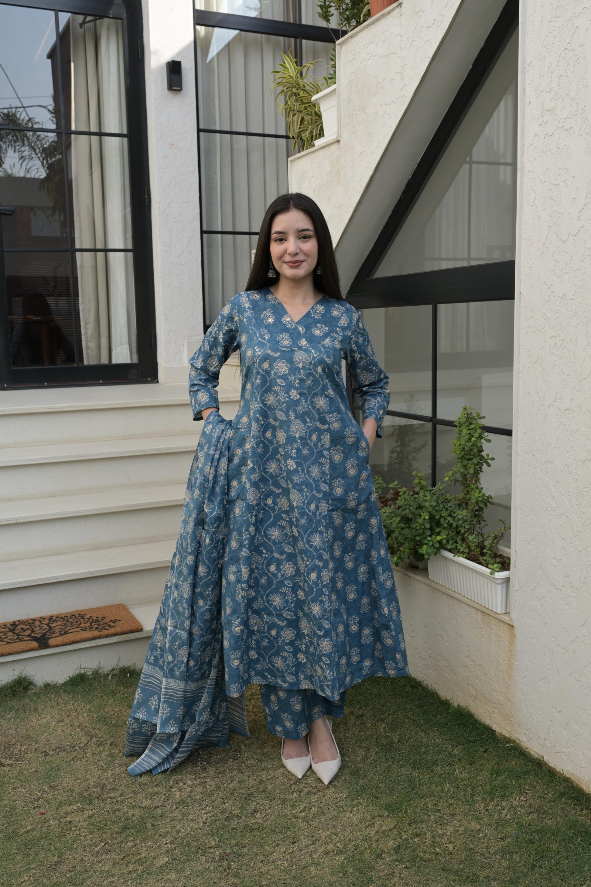 Grace meets comfort in this blue grey cotton Anarkali kurta set, adorned with delicate floral prints that feel calm and timeless. The soft, breathable fabric flows beautifully, making it perfect for effortless everyday elegance or relaxed festive moments. The traditional silhouette adds charm, while the soothing colour creates a refined, graceful look that stays in the mind long after you see it.