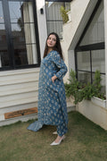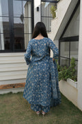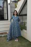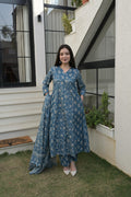 Blue Grey Cotton Traditional Anarkali Kurta Set For Women