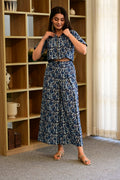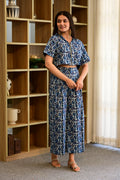 Make a bold style statement with this trendy indigo printed co-ord set. Featuring a cropped shirt with a front zip closure and wide-leg pants, this set blends comfort with effortless elegance. The breathable cotton fabric ensures all-day wearability, making it perfect for casual outings, vacations, or brunch dates.