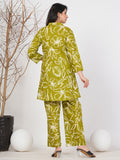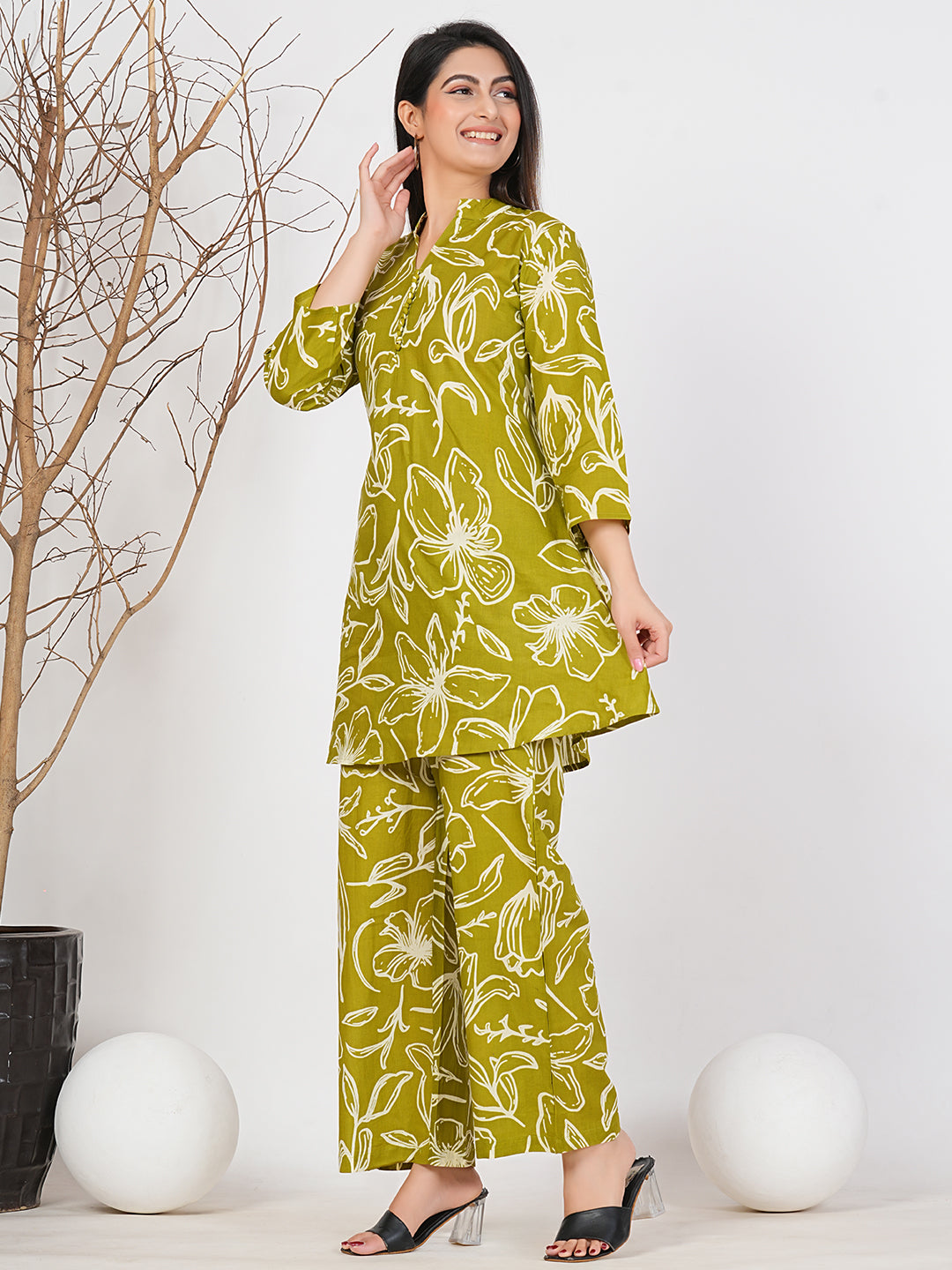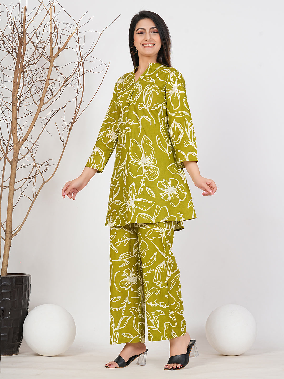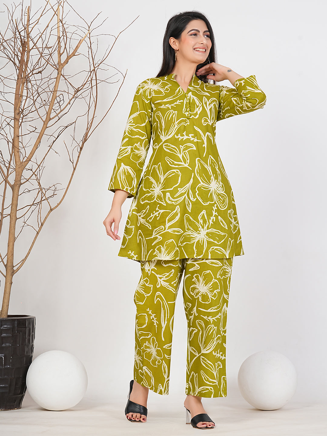 Chic Olive Green Floral Printed Co-ord Set | Ruhii Fashion