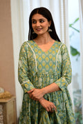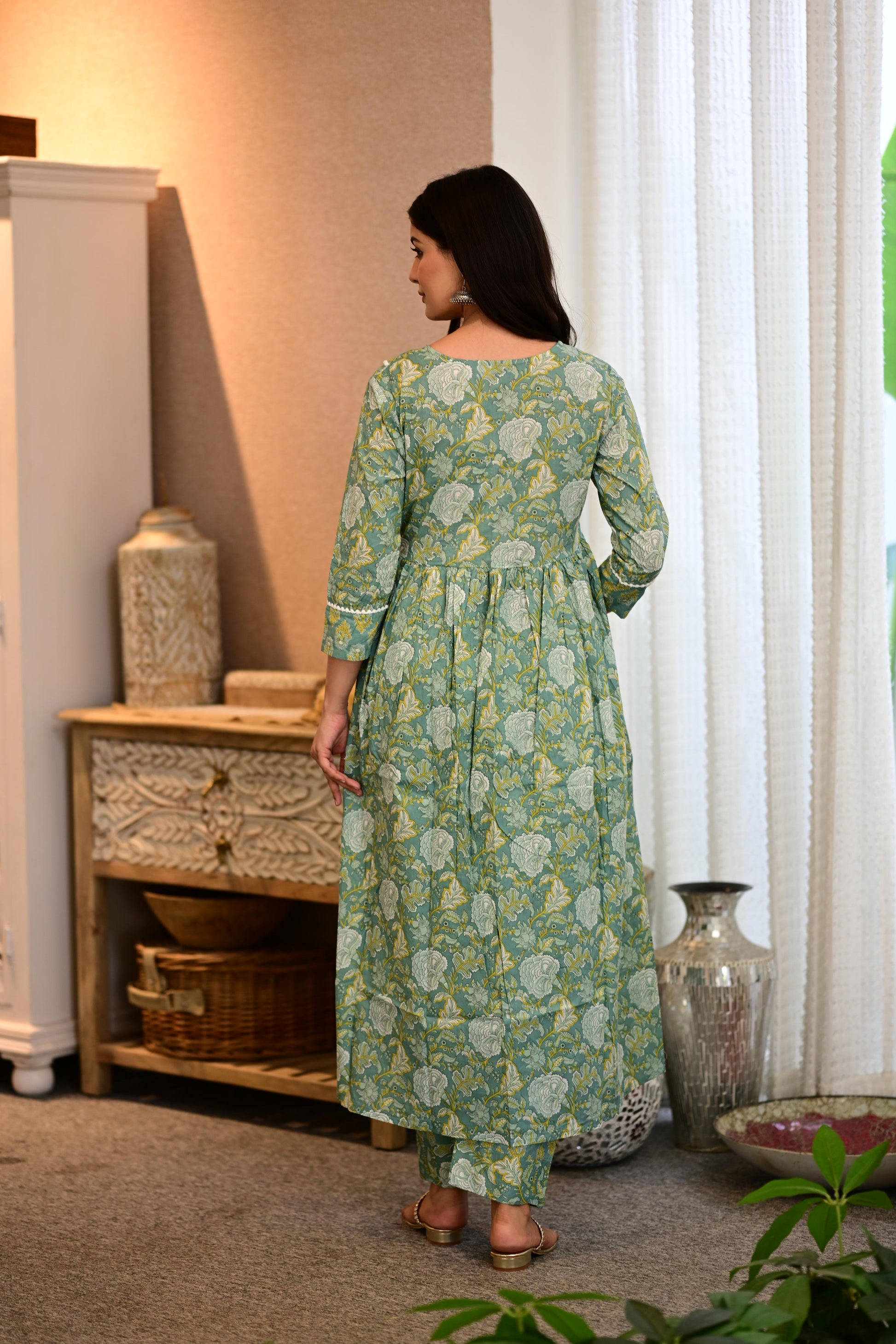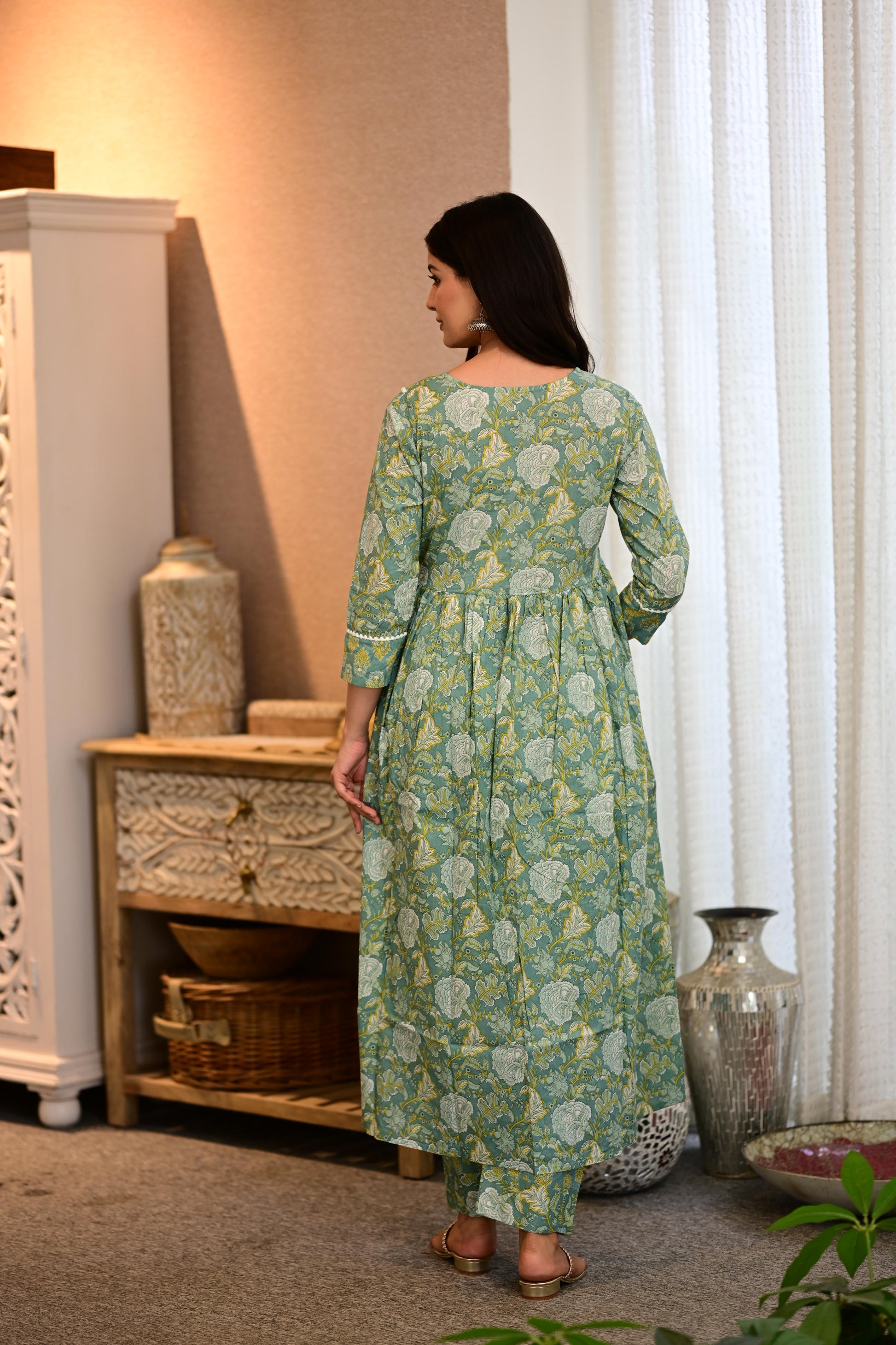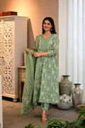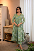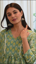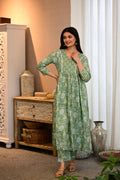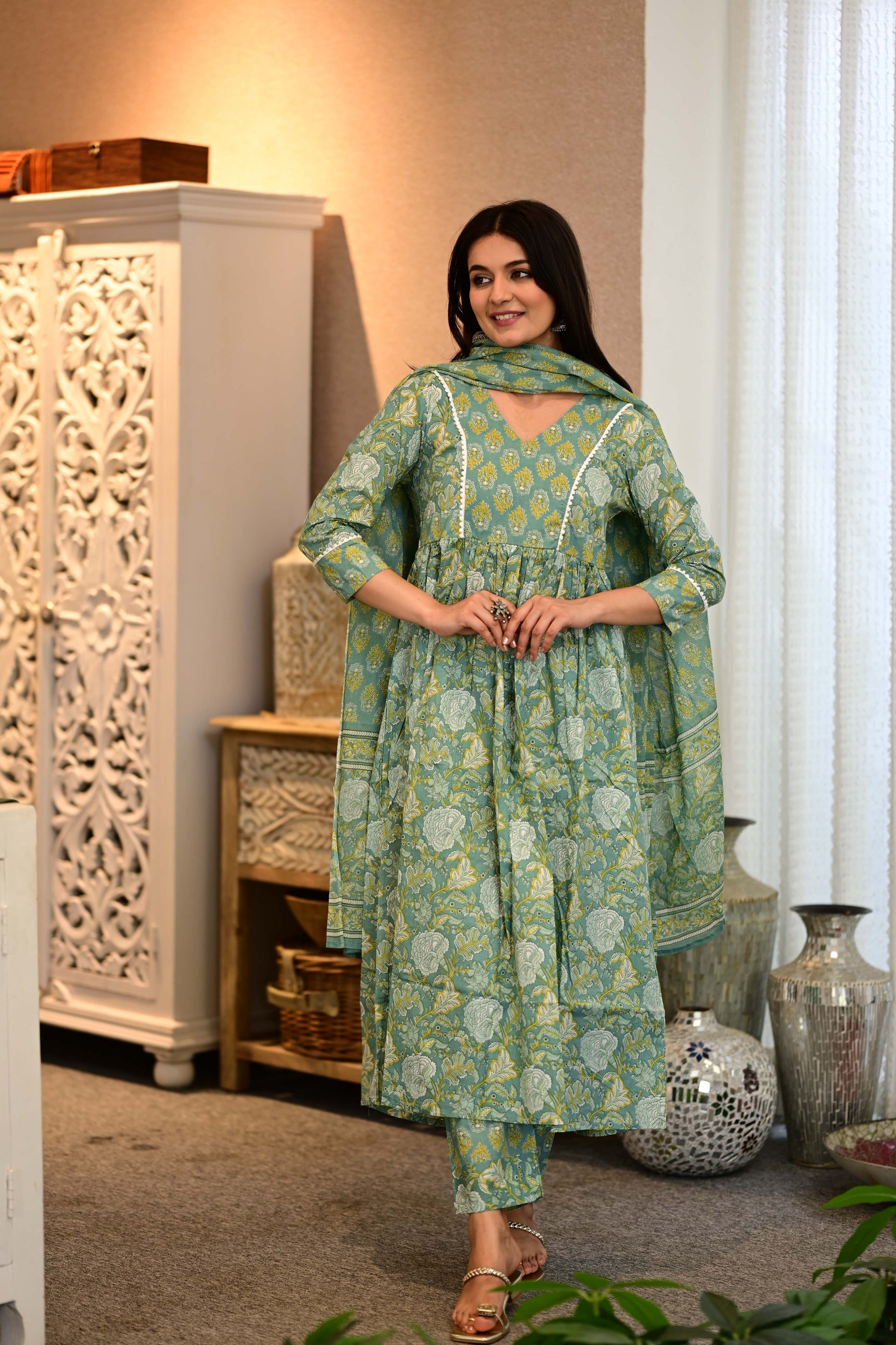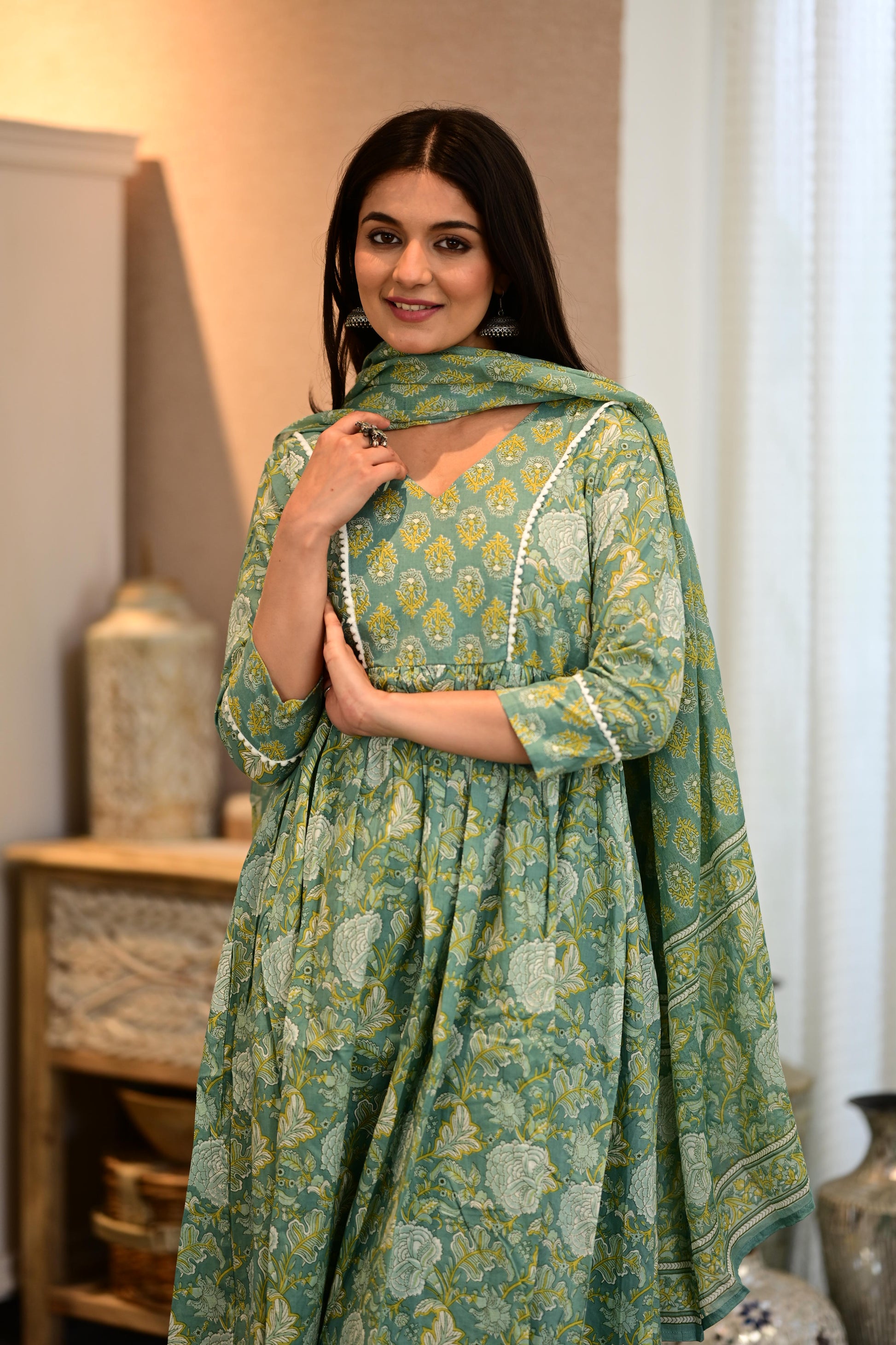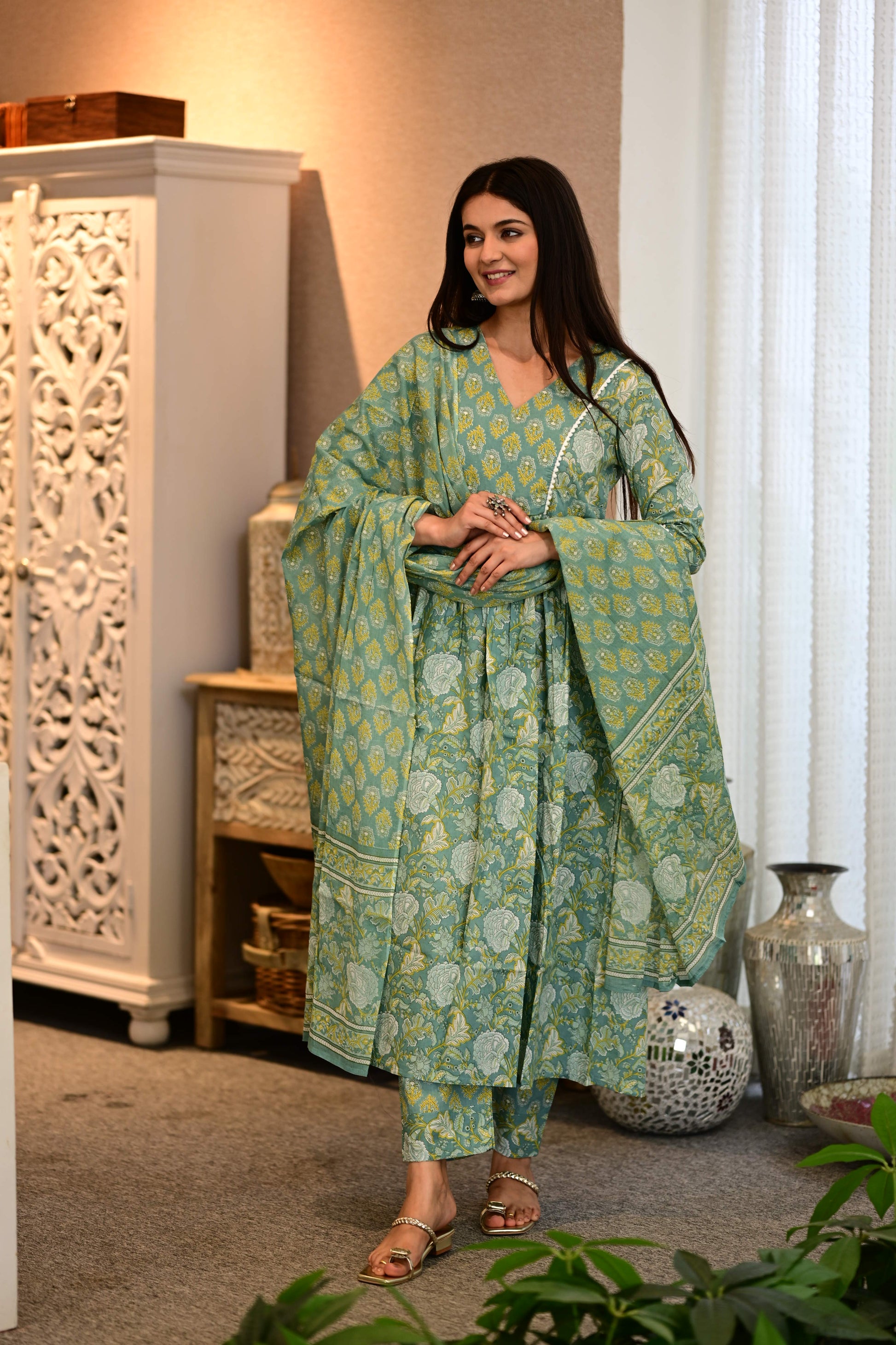 Step into timeless elegance with this beautifully handcrafted pure cotton kurta pant dupatta set. The soothing green base is adorned with intricate floral block prints in shades of ivory and mustard, lending a serene, ethnic charm. The kurta features a flattering V-neckline, three-quarter sleeves, and a gathered flare for a graceful silhouette. Paired with a comfortable tapered pant and a coordinated dupatta, this outfit is perfect for casual outings, festive gatherings, or workwear with a touch of tradition.