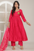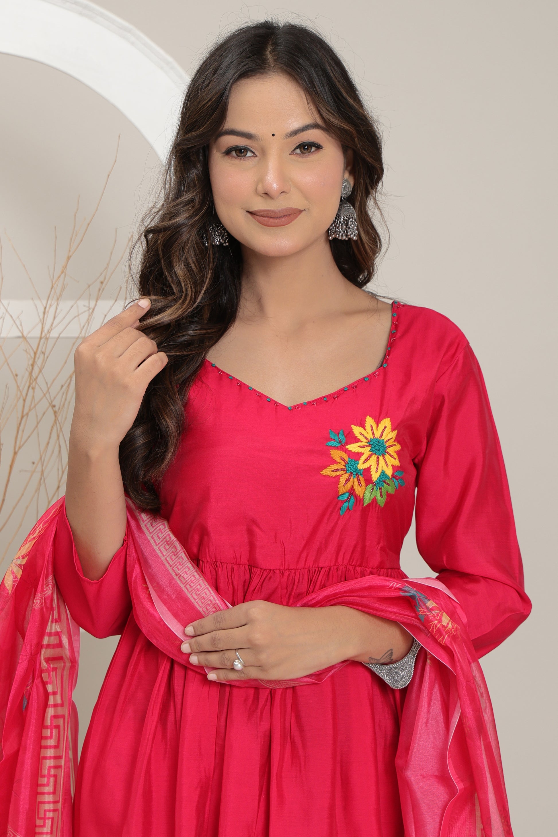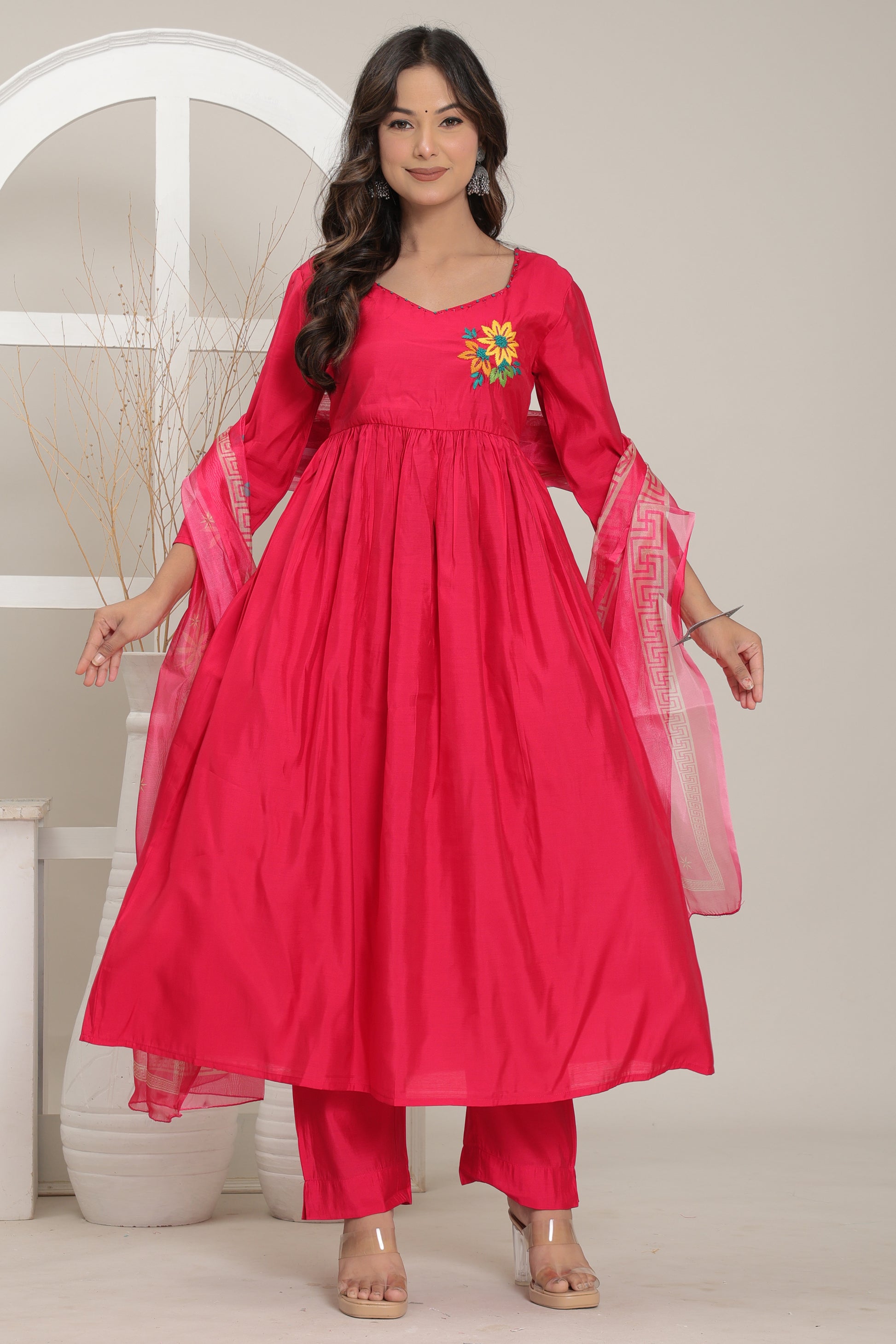 Grace your ethnic wardrobe with the radiant charm of the Gulab Tara Anarkali Set. Draped in a bold and beautiful rose pink hue, this elegant ensemble features a flattering empire-cut Anarkali kurta paired with straight-fit pants and a sheer, matching dupatta. The front is adorned with vibrant floral embroidery, adding a pop of festive flair to the neckline. Crafted from a lustrous, lightweight fabric, this set promises both comfort and timeless elegance. The organza-style dupatta with intricate borders and delicate motifs completes the look, making it ideal for celebrations big and small.