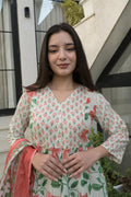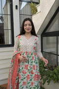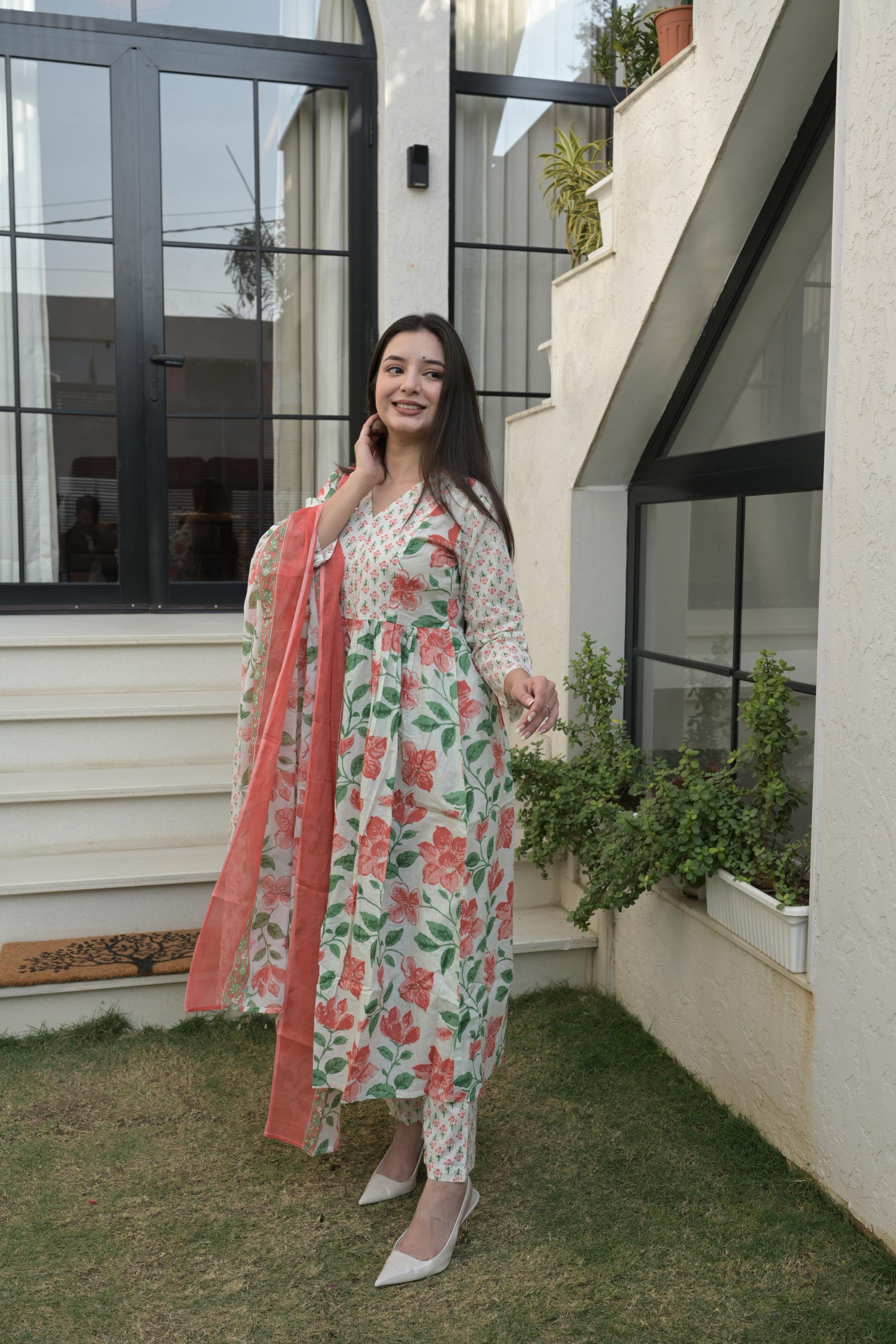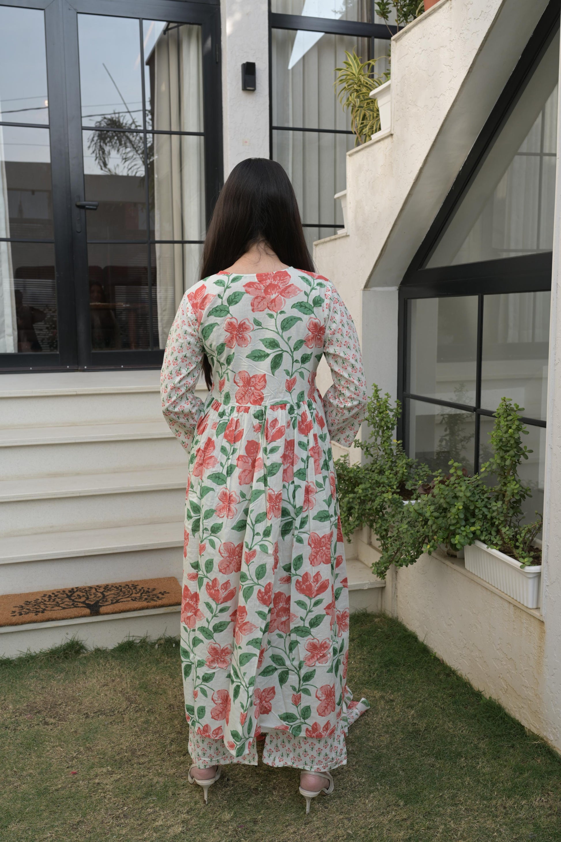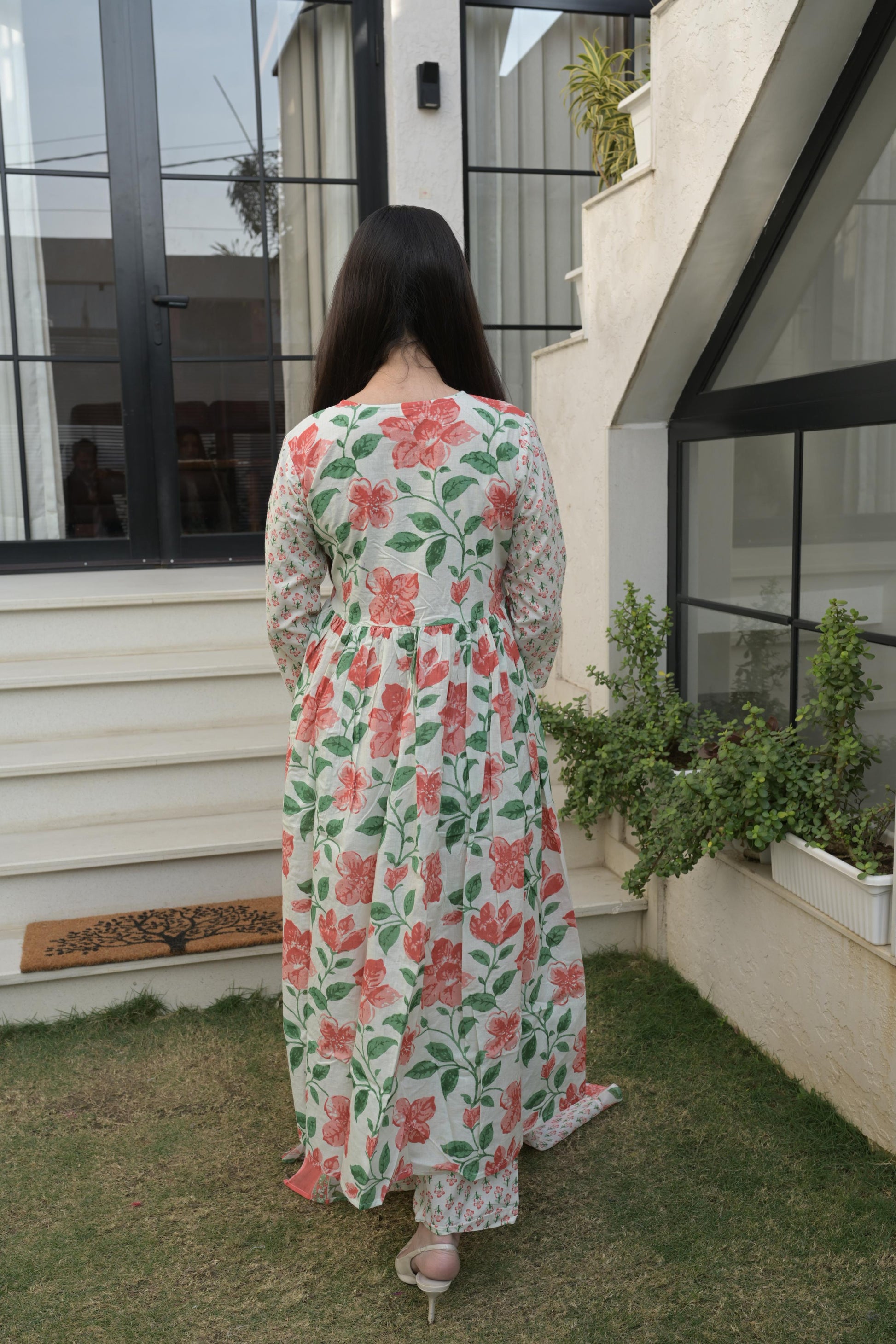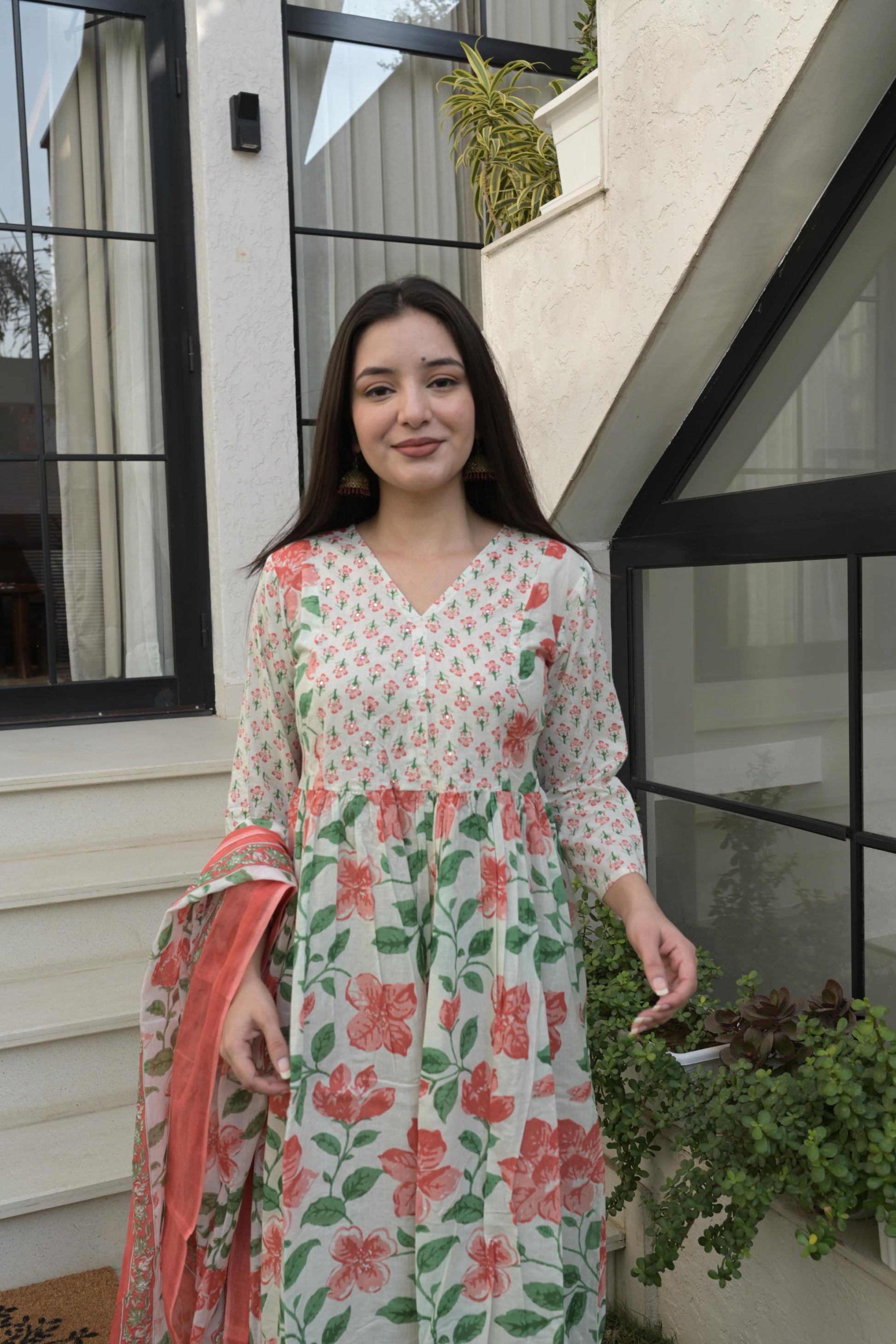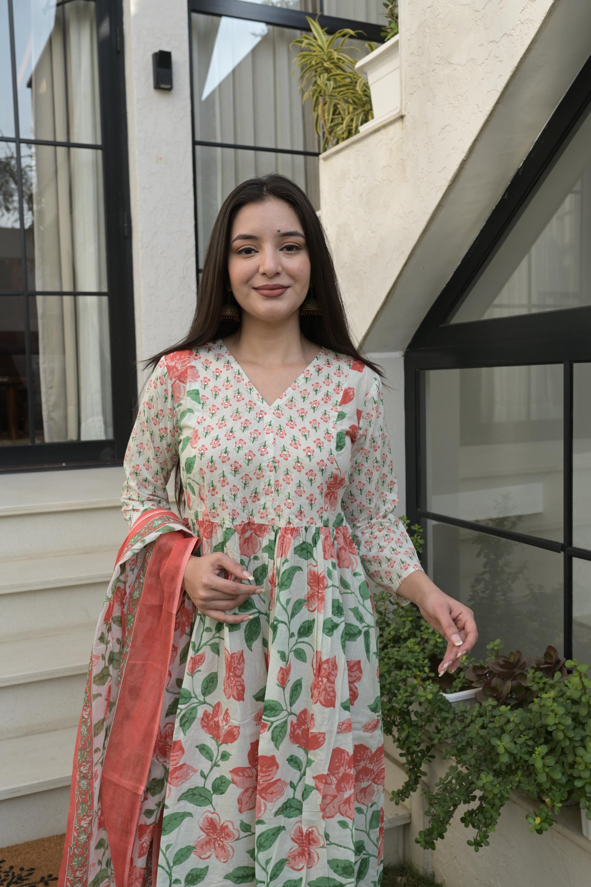 Ivory Cotton Rose Print Anarkali Kurta Set For Women