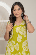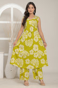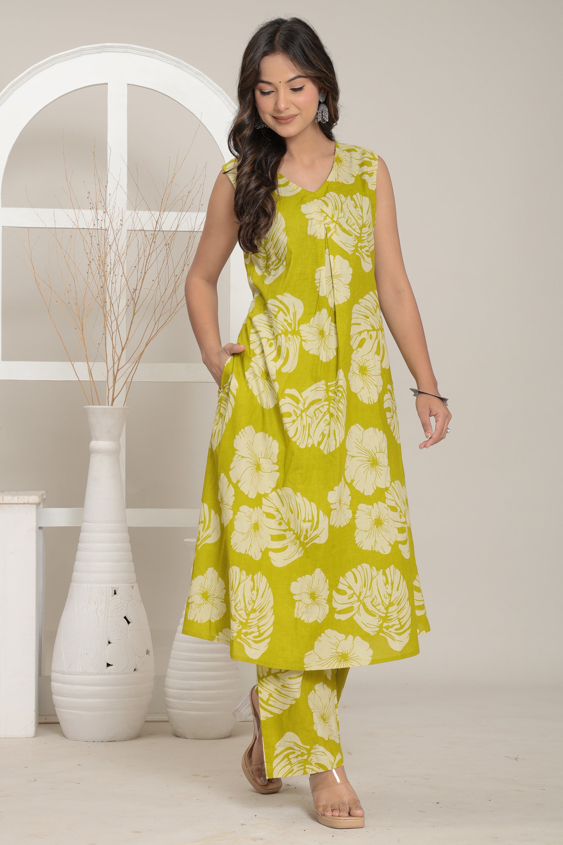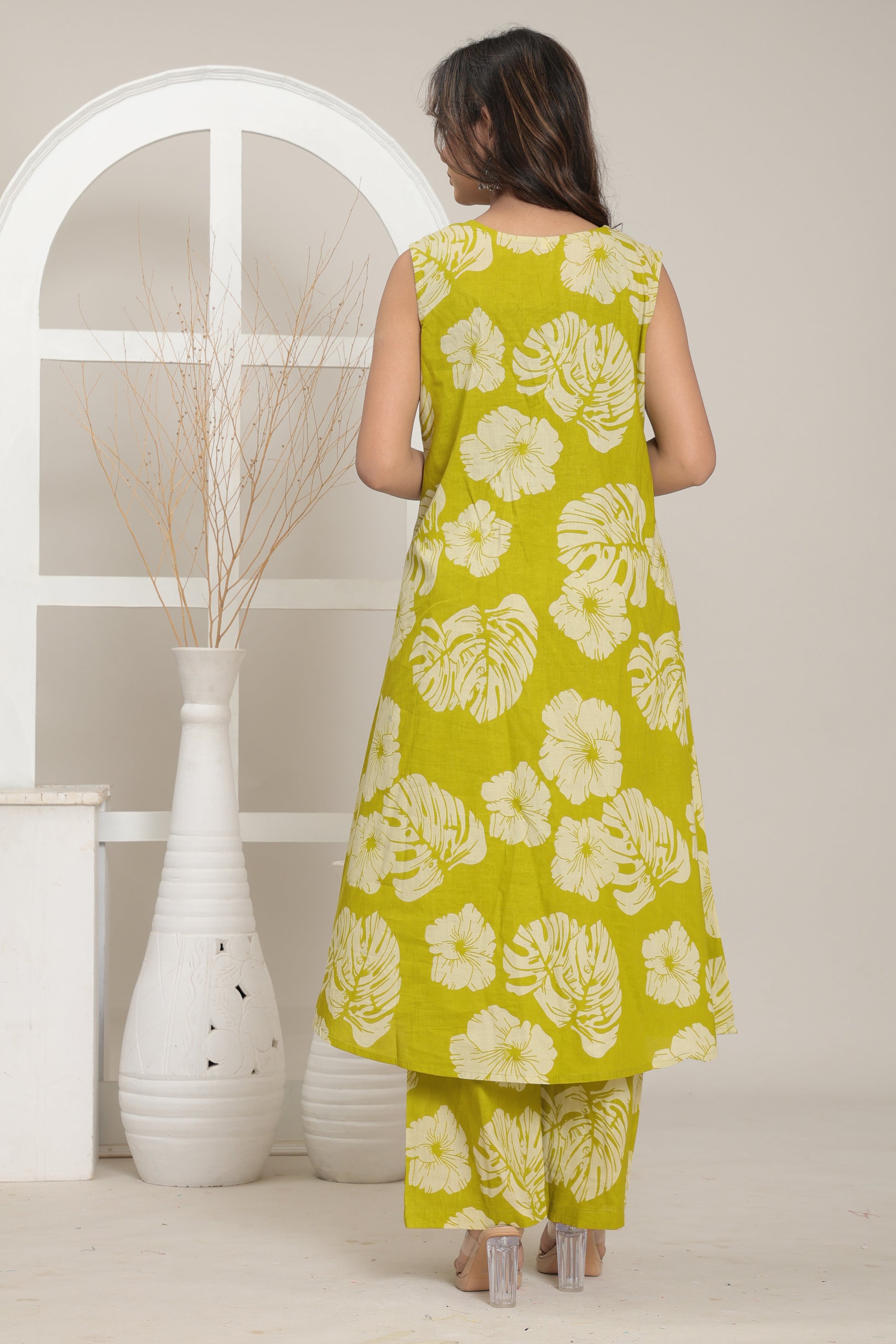 Stay effortlessly stylish and fresh all day long with the Lime Leaf Co-ord Set. Crafted in a breezy lime green hue, this sleeveless ensemble features bold tropical leaf and floral prints in soft ivory, perfect for channeling vacation vibes even on busy days. The kurta boasts a flattering V-neckline and subtle front pleats for a relaxed fit, while the matching printed pants offer all-day ease. Whether you're heading out for brunch or running errands in style, this lightweight cotton set promises comfort with a burst of brightness.