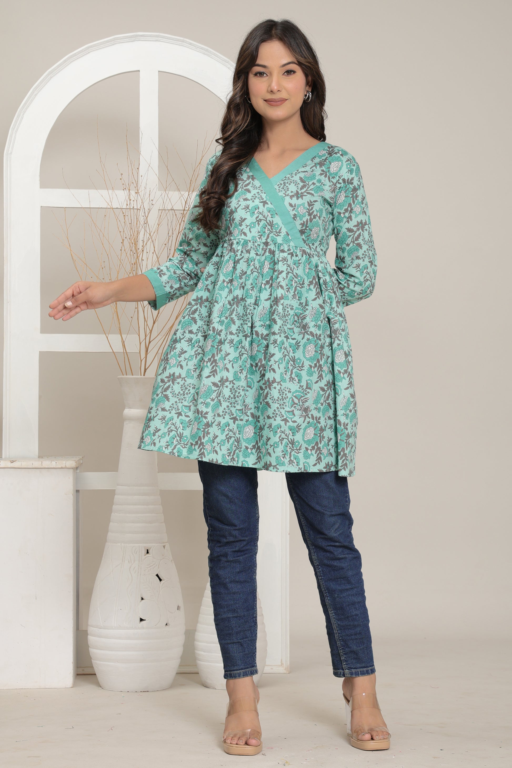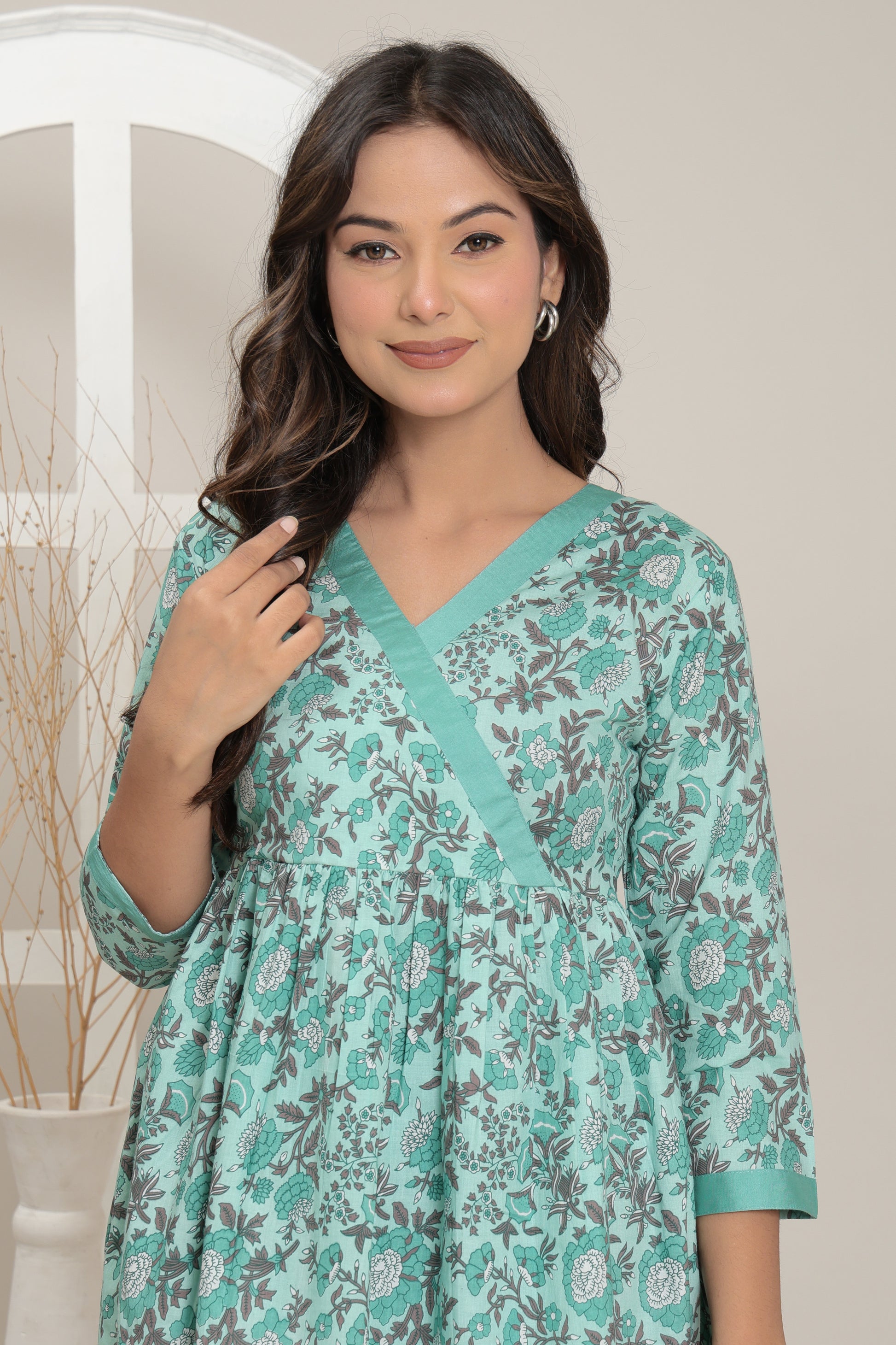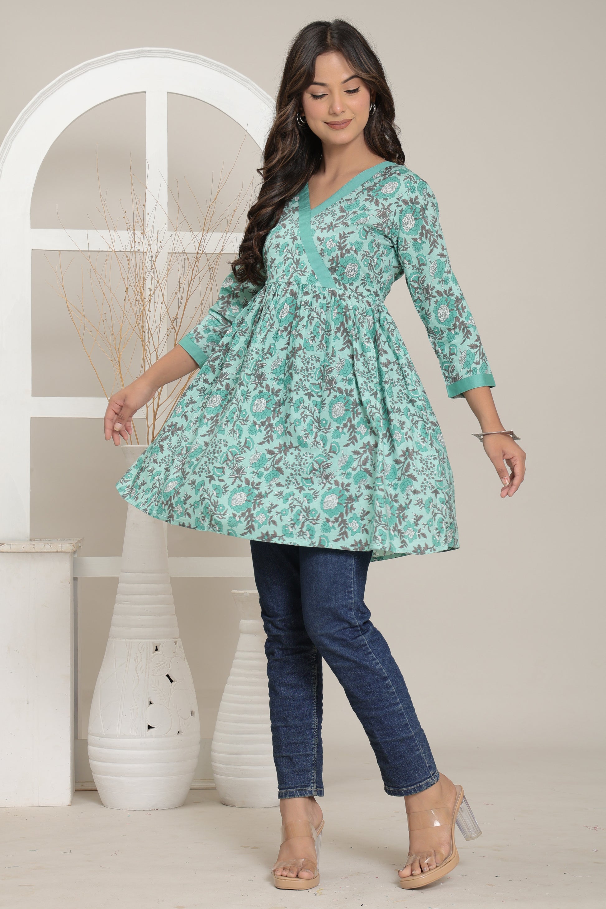 Brighten your everyday style with the refreshing charm of the Mint Meadow Flared Kurti. Featuring a serene mint green base adorned with intricate floral block prints in earthy tones, this kurti brings a breezy vibe to casual dressing. The flattering V-neckline with solid piping detail, 3/4th sleeves, and empire-line silhouette offers a graceful fit that flares gently over the waist for comfort and ease. Crafted in soft, breathable cotton, it's perfect for pairing with jeans or leggings for a relaxed yet refined look.