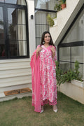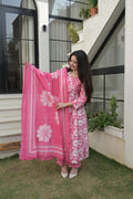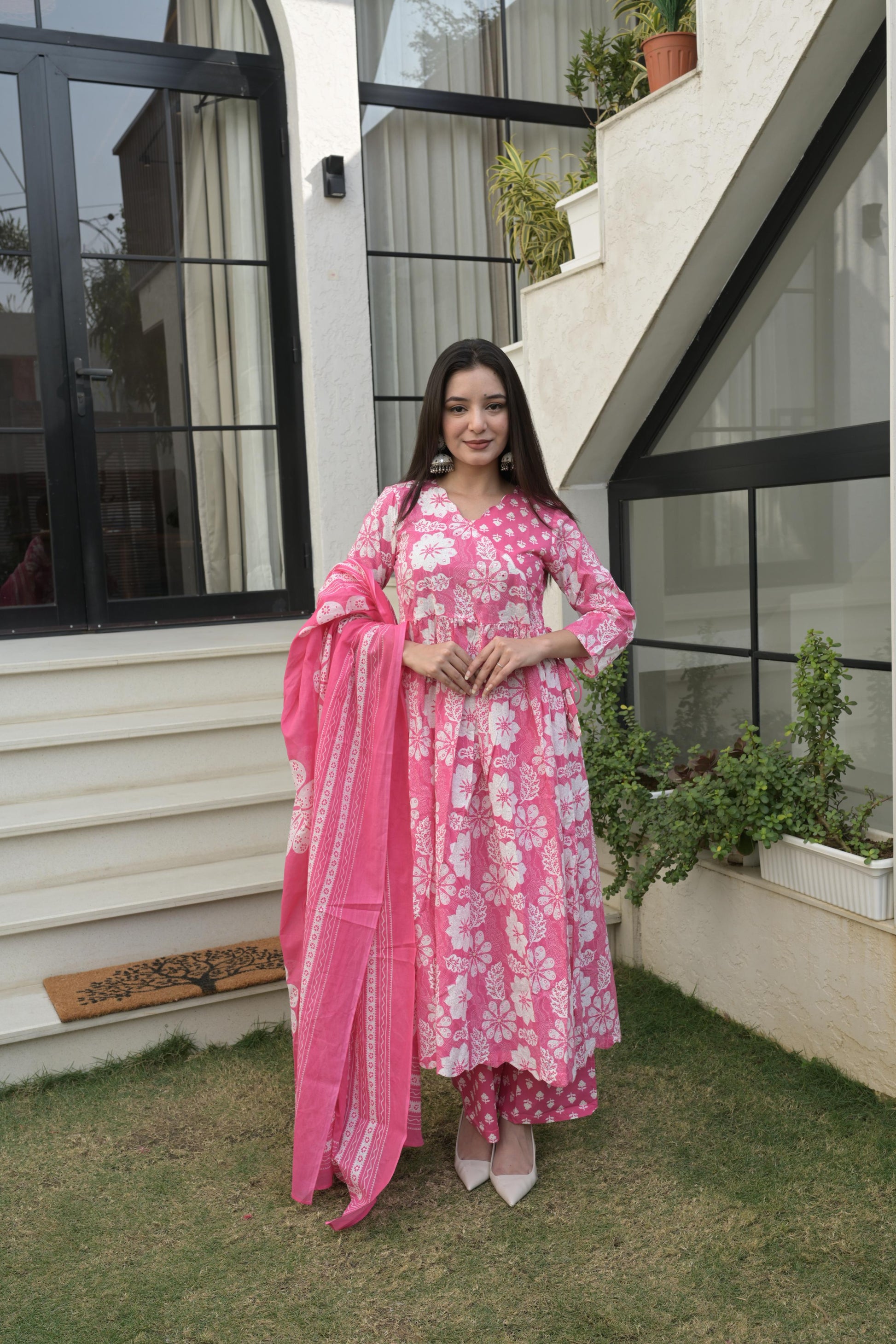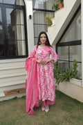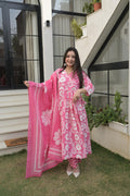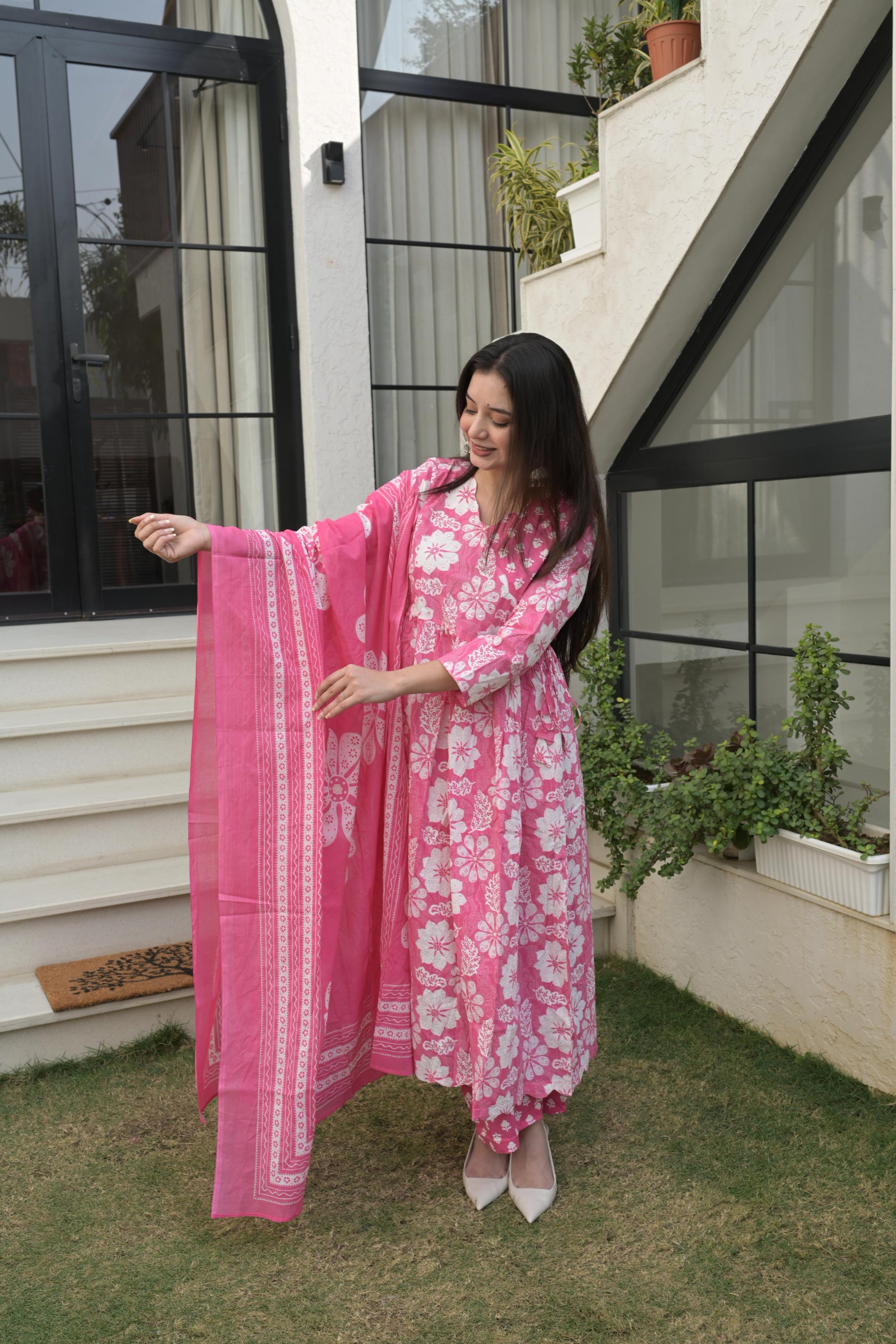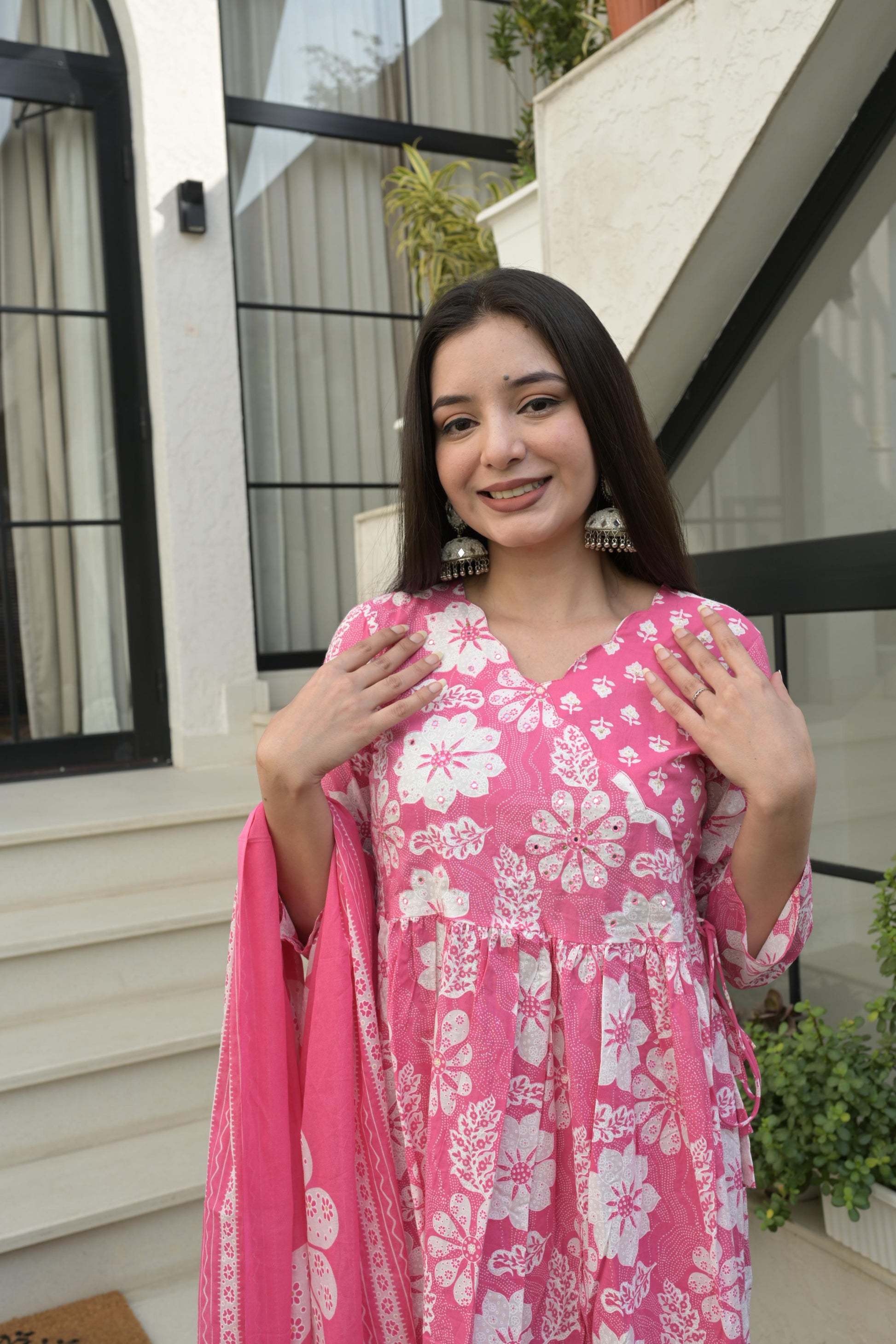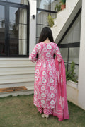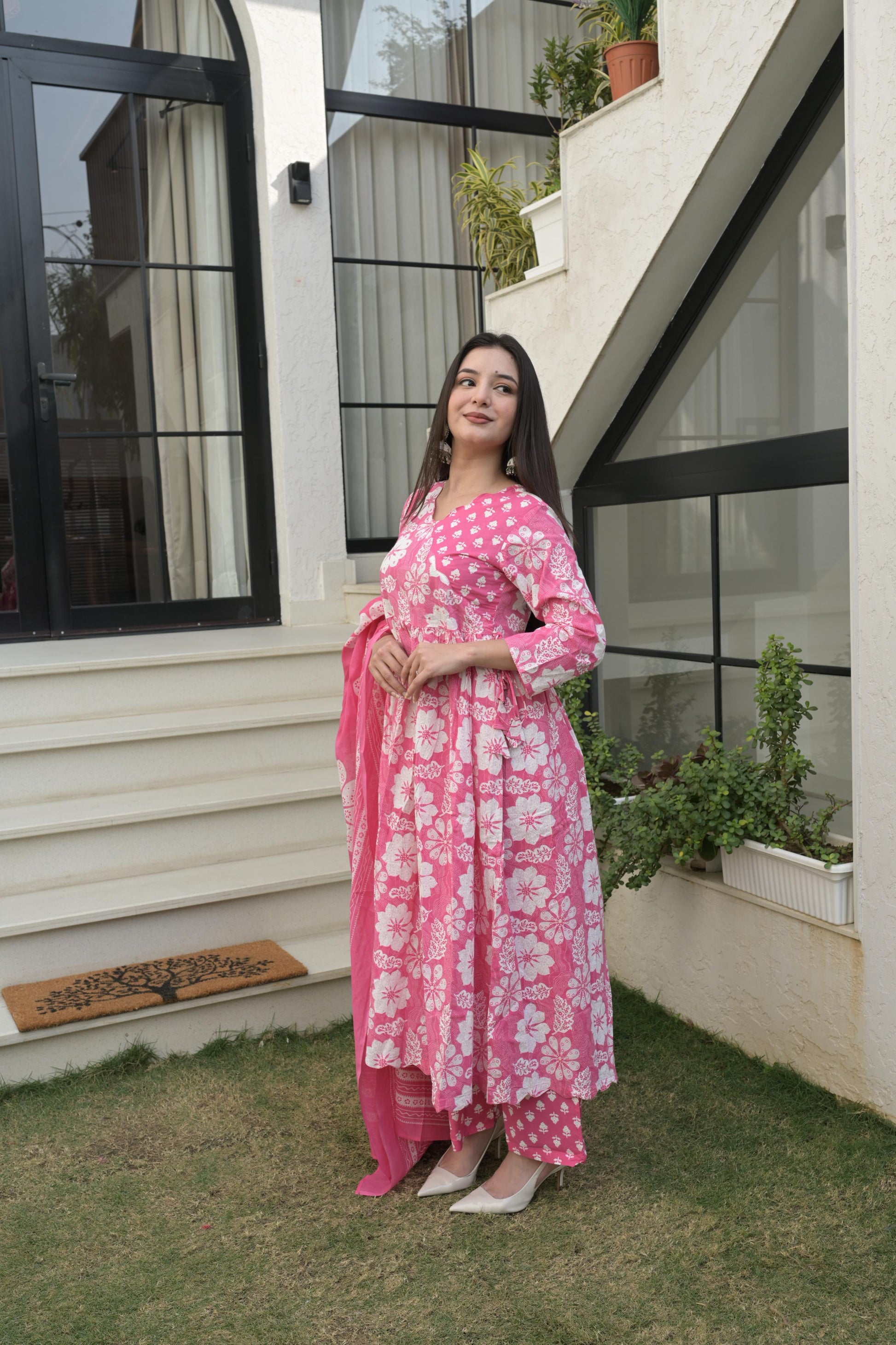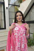 Pink Cotton Floral Print Anarkali Kurta Set For Women