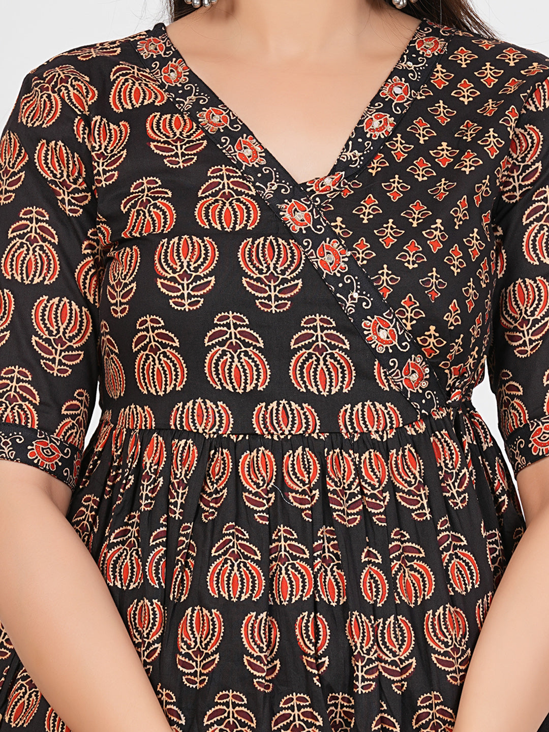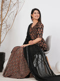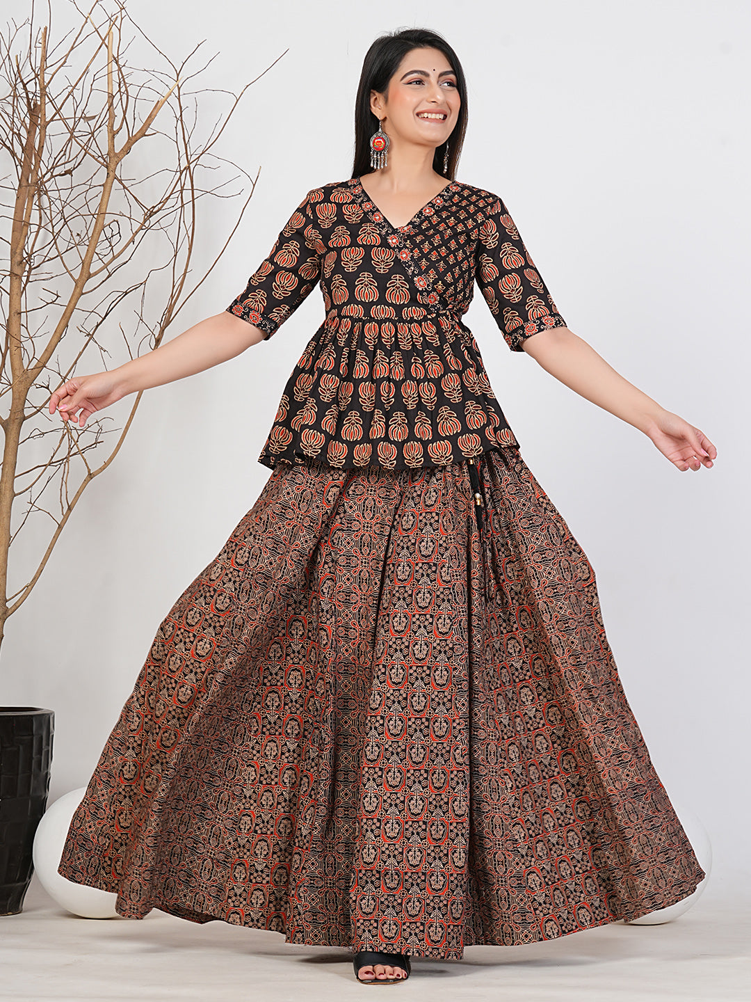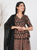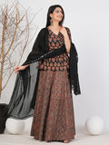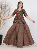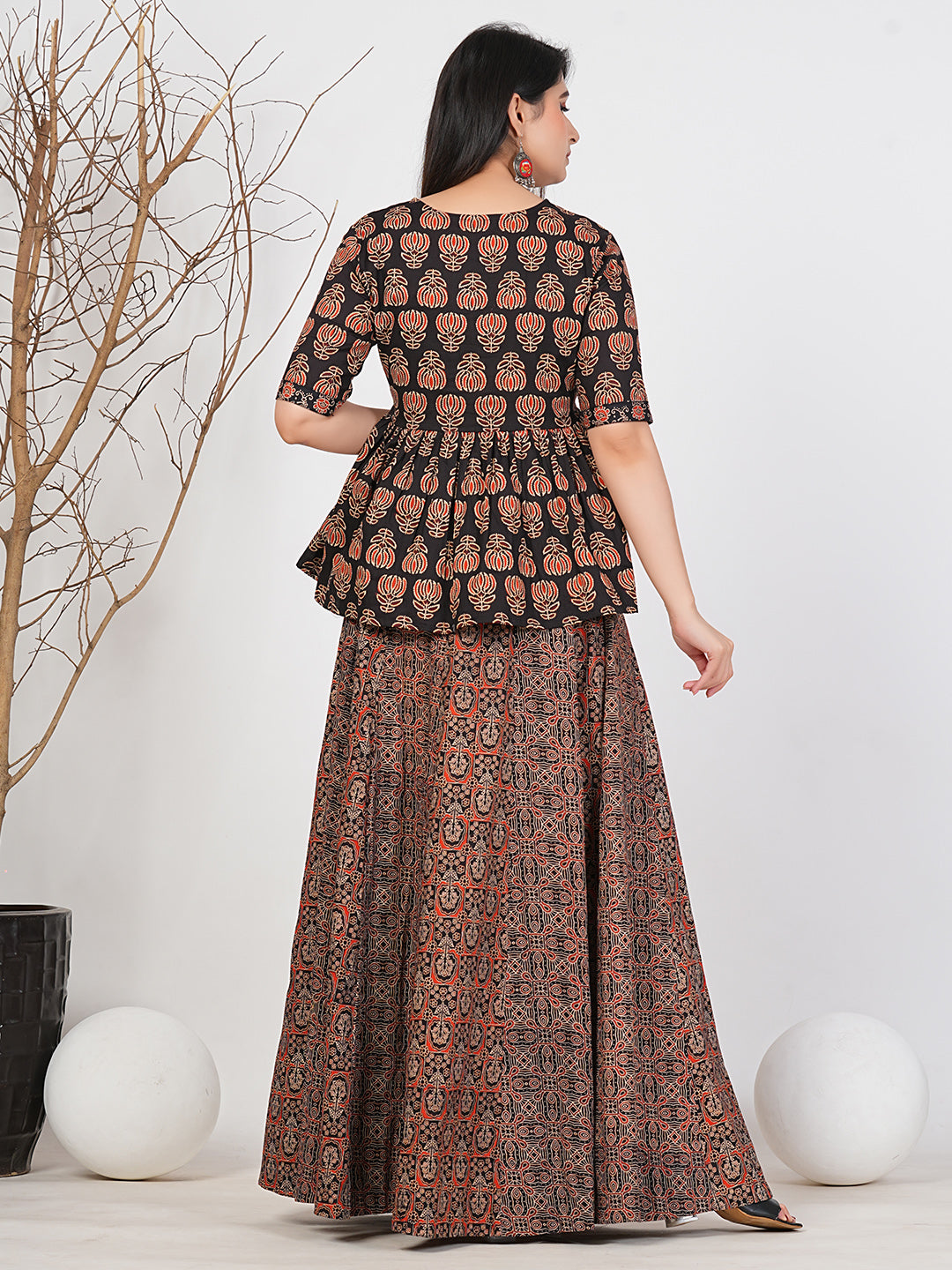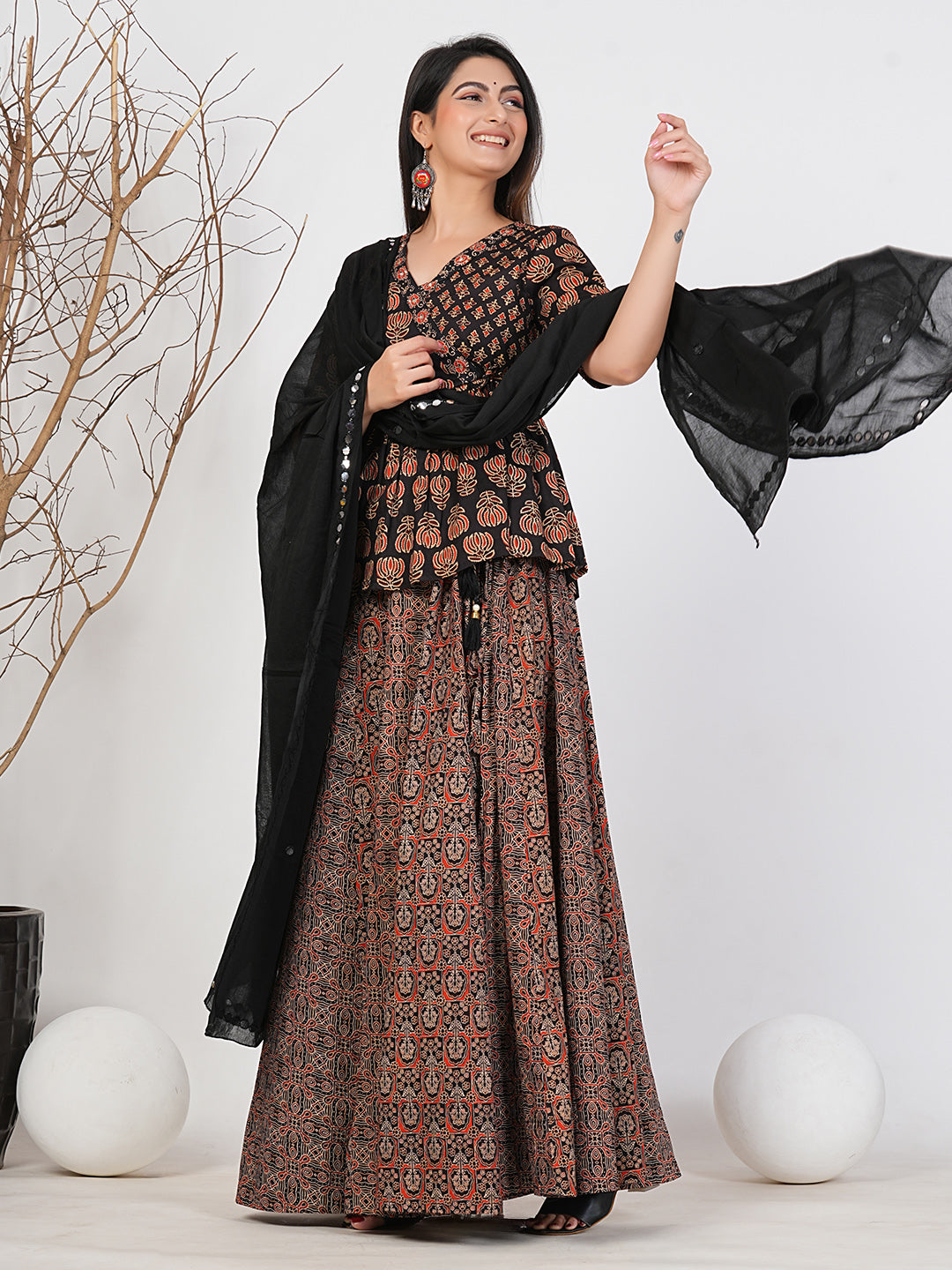Ruii Fashion Black Peony-Print Peplum Kurta with Lehenga and Dupatta