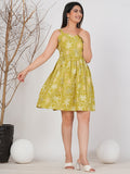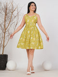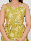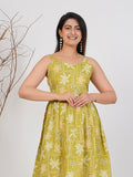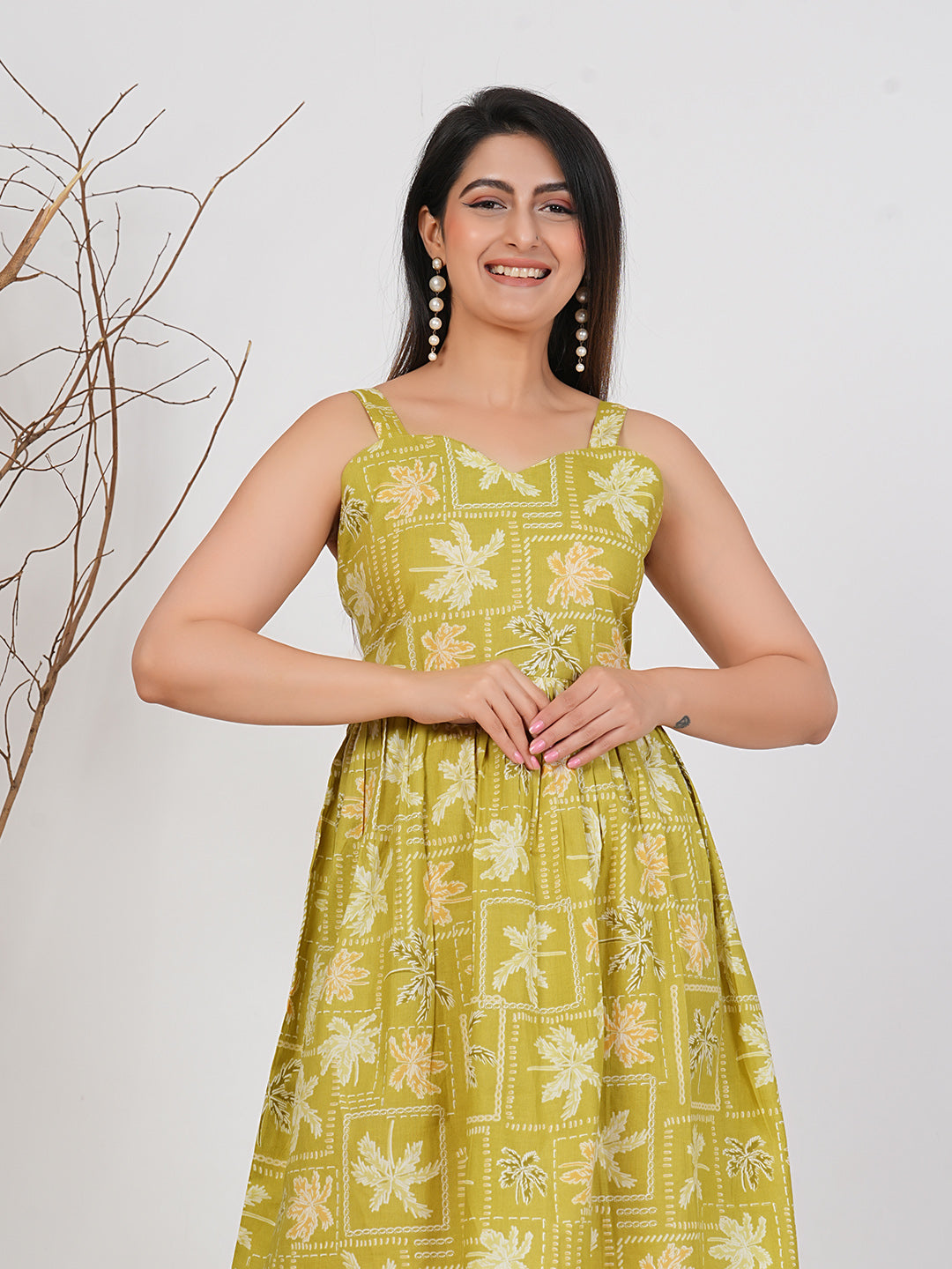 Embrace nature-inspired elegance with this stunning maxi dress from Ruii Fashion, featuring a lush green fabric adorned with intricate leaf patterns in white and peach. The sleeveless design with wide straps and a cinched waist offers a comfortable yet stylish fit, perfectly paired with pearl earrings for a refined touch. Ideal for a fresh, seasonal look.