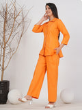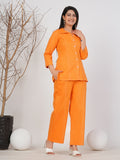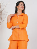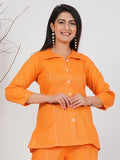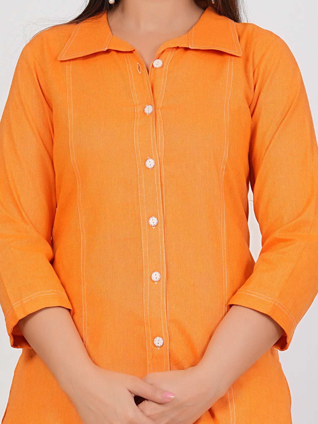 Elevate your style with this stunning orange outfit from Ruii Fashion, featuring a chic button-down tunic paired with matching trousers. The three-quarter sleeves and elegant stitching details add a modern touch, while the pearl drop earrings complement the vibrant look perfectly. Ideal for a casual yet sophisticated appearance, this ensemble is a must-have for any fashion-forward wardrobe.