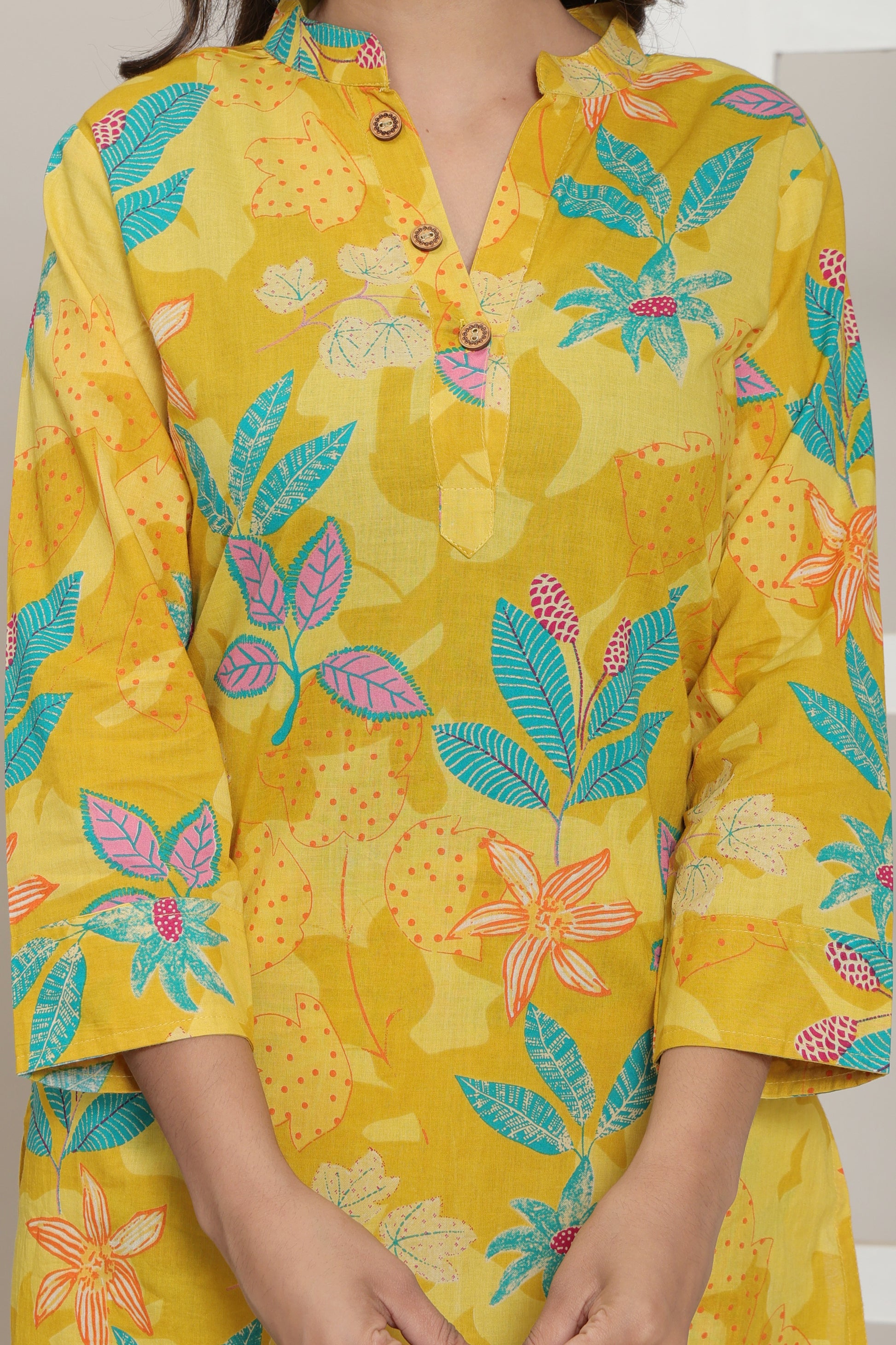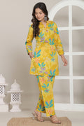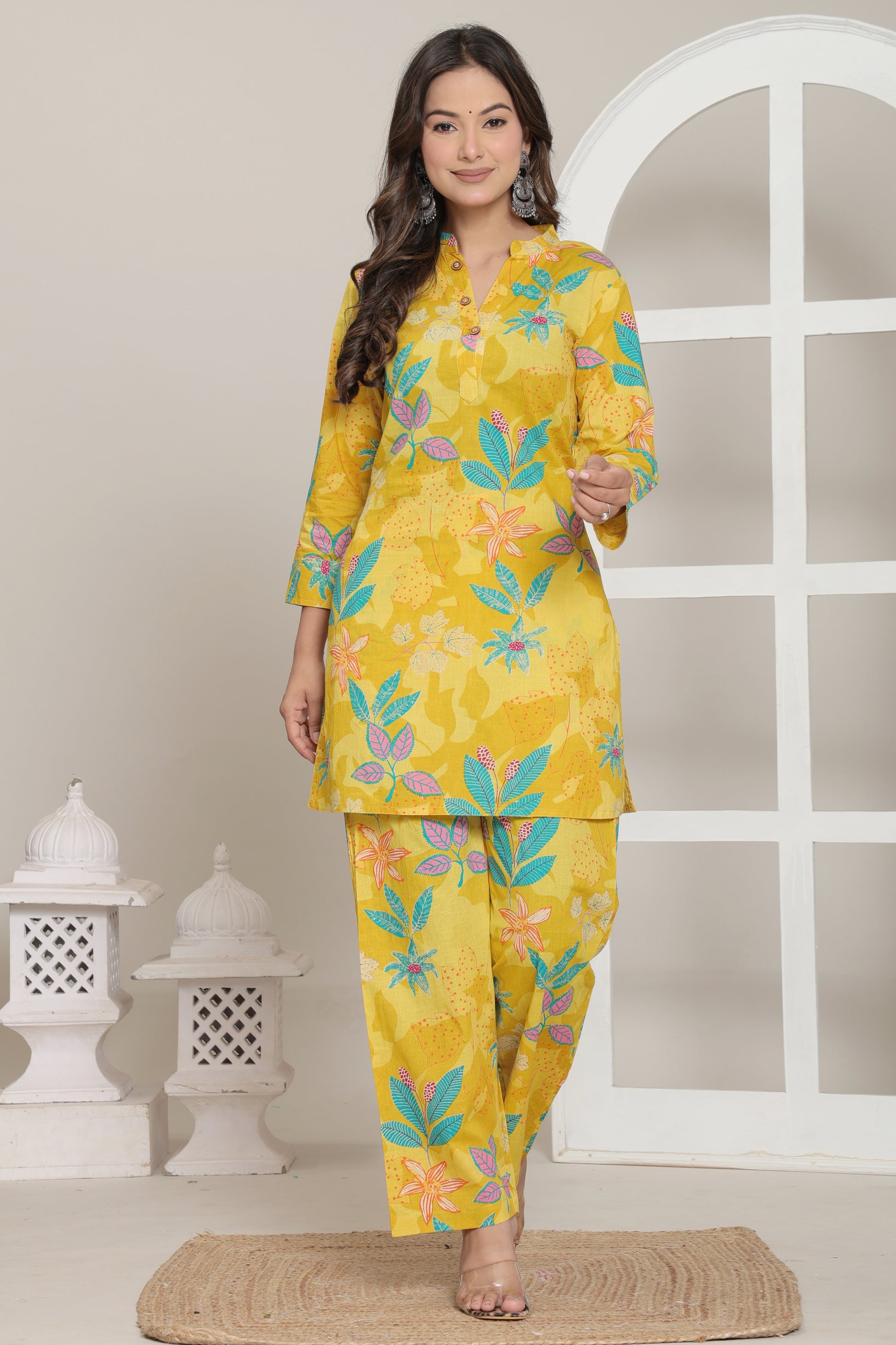 Embrace breezy freshness with the Sun Shine Co-ord Set – where timeless florals meet vibrant hues for an effortlessly chic look. This two-piece set features a straight-cut co-rd in a stunning Sun Shine base, beautifully contrasted with oversized ivory floral prints that exude charm and sophistication. Designed in a soft, breathable cotton fabric, it offers both style and comfort for all-day wear. The smart mandarin collar and front placket add a touch of modernity, while the matching straight-fit pants complete the look with seamless coordination.
