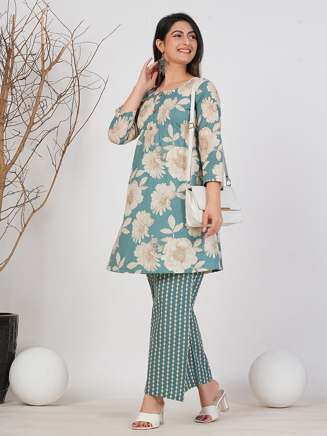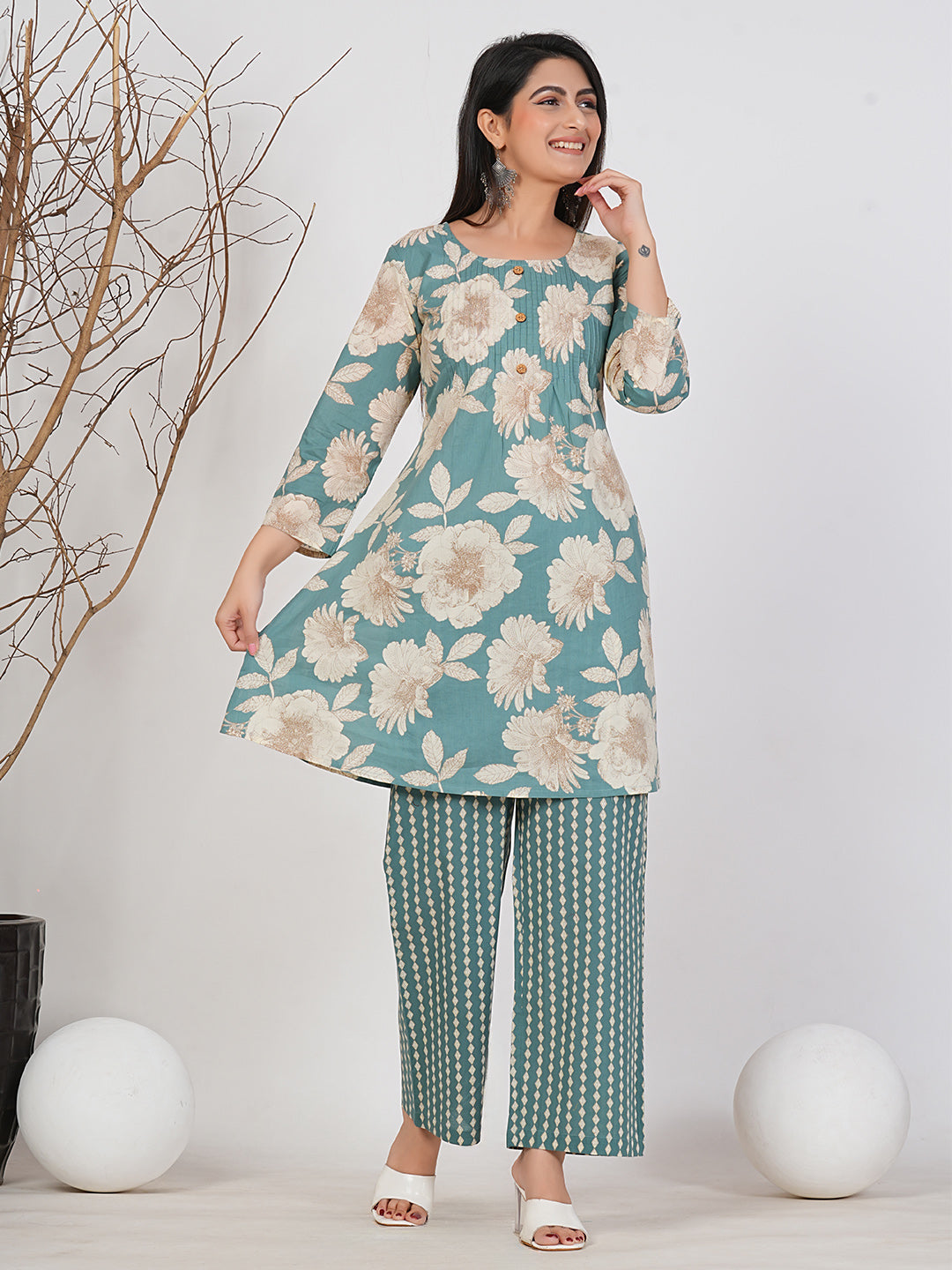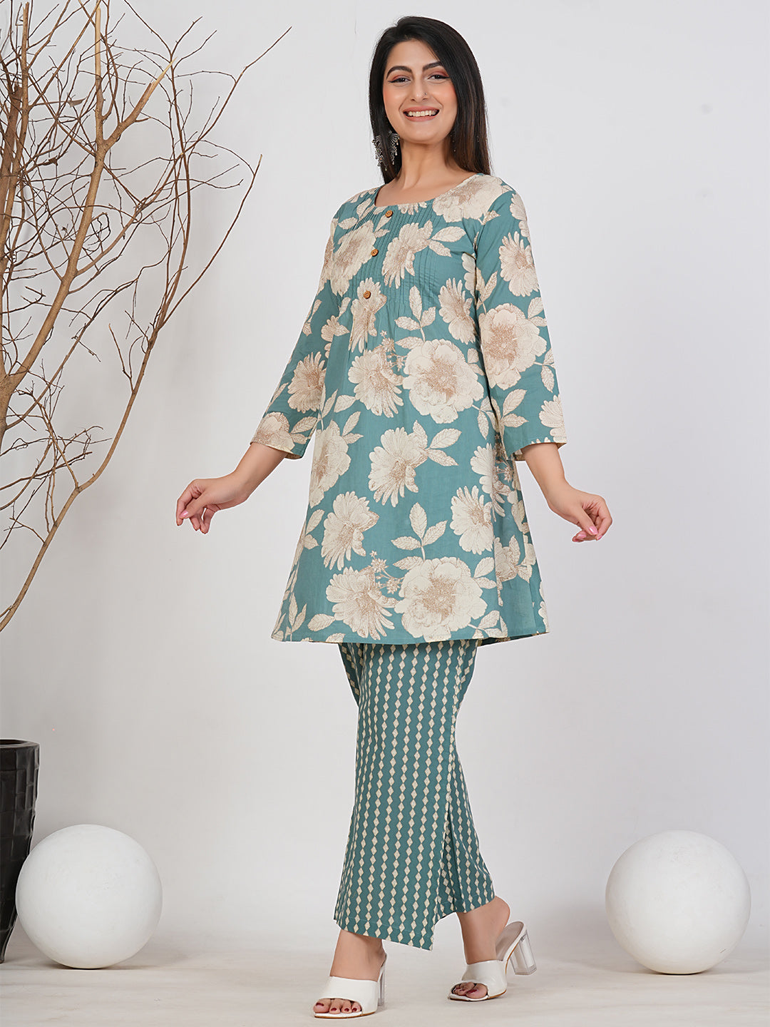 Refresh your wardrobe with this elegant teal floral co-ord set from Ruii Fashions. The soothing teal base adorned with large beige floral prints brings a perfect balance of sophistication and freshness. Paired with complementing patterned trousers, this ensemble exudes effortless style and comfort. Made from soft, breathable fabric, it’s ideal for brunches, festive gatherings, or casual outings. The flattering silhouette and contemporary design make it a standout choice for the modern woman.